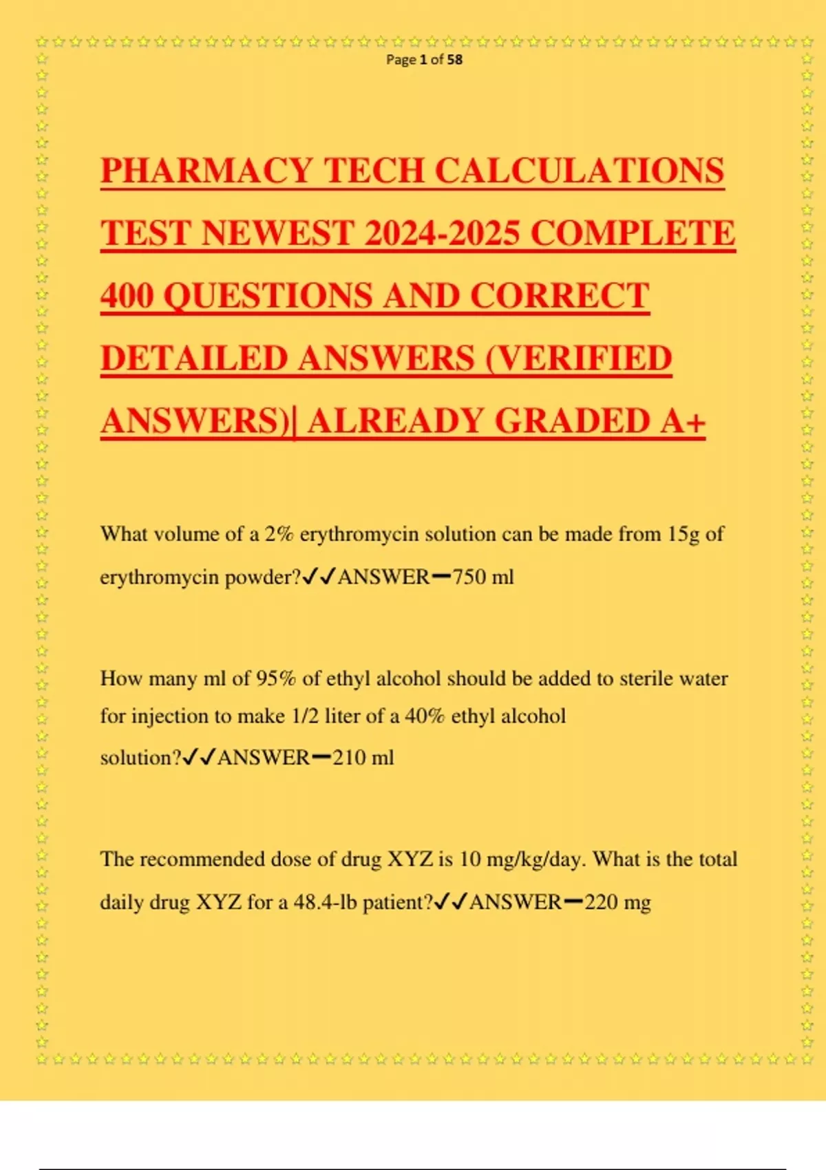 PHARMACY TECH CALCULATIONS TEST NEWEST COMPLETE 400 QUESTIONS AND CORRECT DETAILED ANSWERS (VERIFIED ANSWERS)| ALREADY GRADED A+
