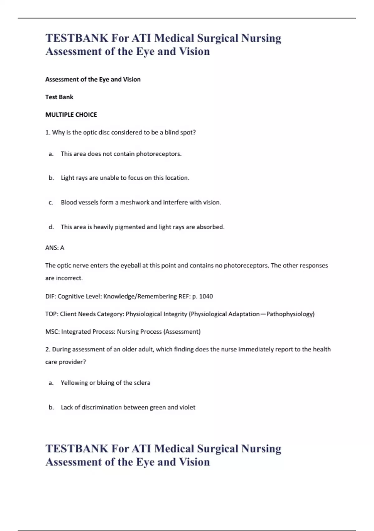 TESTBANK For ATI Medical Surgical Nursing Assessment of the Eye and Vision TESTBANK For ATI Medical Surgical Nursing Assessment of the Eye and Vision Assessment of the Eye and Vision Test Bank MULTIPLE CHOICE 1. Why is the optic disc considered to be a blind spot? a. This area does not contain photoreceptors. b. Light rays are unable to focus on this location. c. Blood vessels form a meshwork and interfere with vision. d. This area is heavily pigmented and light rays are absorbed. ANS: A The optic nerve enters the eyeball at this point and contains no photoreceptors. The other responses are incorrect. DIF: Cognitive Level: Knowledge/Remembering REF: p. 1040 TOP: Client Needs Category: Physiological Integrity (Physiological Adaptation—Pathophysiology) MSC: Integrated Process: Nursing Process (Assessment) 2. During assessment of an older adult, which finding does the nurse immediately report to the health care provider? a. Yellowing or bluing of the sclera b. Lack of discrimination between green and violet TESTBANK For ATI Medical Surgical Nursing Assessment of the Eye and Vision TESTBANK For ATI Medical Surgical Nursing Assessment of the Eye and Vision c. An opaque, bluish-white ring within the outer edge of the cornea d. Pupil constriction in response to light occurring in 2 seconds ANS: D In an older client, it is normal for the sclera to turn yellow or blue with aging. It is also common for the older adult to have problems discriminating between the colors of green, blue, and violet. Arcus senilis, an opaque, bluish-white ring on the edge of the cornea, is a common occurrence in the older adult. This does not cause vision loss. Pupil constriction as a reaction to light should occur in less than 1 second. If pupil constriction takes longer, then the reaction is considered sluggish and should be reported to the provider. DIF: Cognitive Level: Application/Applying or higher REF: N/A TOP: Client Needs Category: Physiological Integrity (Physiological Adaptation—Alterations in Body Systems) MSC: Integrated Process: Nursing Process (Assessment) 3. Which teaching is essential for a client who is going to have intraocular pressure measurement with a slit lamp? a. “The test causes temporary blindness.” b. “The test is quick and a local anesthetic is used.” c. “The test does cause a little pain, but it is over quickly.” d. “The test causes some tearing, but no pain.” ANS: B The IOP test done with a slit lamp must have direct eye contact, which could cause discomfort, so a local anesthetic is used. The test is quick but does not cause temporary blindness. TESTBANK For ATI Medical Surgical Nursing Assessment of the Eye and Vision TESTBANK For ATI Medical Surgical Nursing Assessment of the Eye and Vision DIF: Cognitive Level: Application/Applying or higher REF: N/A TOP: Client Needs Category: Health Promotion and Maintenance (Health Screening) MSC: Integrated Process: Teaching/Learning 4. The nurse performs an assessment of a client’s extraocular movement and notes no difficulty. Which additional assessment data assist in confirming this finding? a. No episodes of double vision b. Synchronized blinking movements c. No reports of headaches and dizziness d. Both pupils constricting equally in response to light ANS: A The voluntary muscles of the orbit rotate the eye and coordinate eye movements to ensure that the retina of each eye receives an image at the same time, so that only a single image is perceived. If the client has reported double vision, this would indicate a problem with this coordination. The other answers are not related to extraocular eye movements. DIF: Cognitive Level: Application/Applying or higher REF: N/A TOP: Client Needs Category: Health Promotion and Maintenance (Health Screening) MSC: Integrated Process: Nursing Process (Assessment)