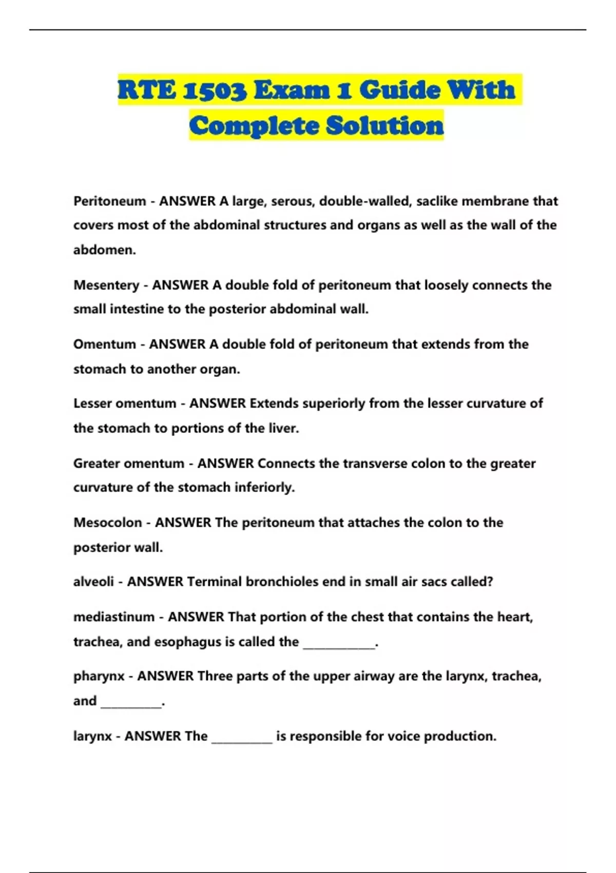 RTE 1503 Exam 1 G uide W ith Compl ete Solution Peritoneum - ANSWER A large, serous, double-walled, saclike membrane that covers most of the abdominal structures and organs as well as the wall of the abdomen. Mesentery - ANSWER A double fold of peritoneum that loosely connects the small intestine to the posterior abdominal wall. Omentum - ANSWER A double fold of peritoneum that extends from the stomach to another organ. Lesser omentum - ANSWER Extends superiorly from the lesser curvature of the stomach to portions of the liver. Greater omentum - ANSWER Connects the transverse colon to the greater curvature of the stomach inferiorly. Mesocolon - ANSWER The peritoneum that attaches the colon to the posterior wall. alveoli - ANSWER Terminal bronchioles end in small air sacs called? mediastinum - ANSWER That portion of the chest that contains the heart, trachea, and esophagus is called the _____________. pharynx - ANSWER Three parts of the upper airway are the larynx, trachea, and ___________. larynx - ANSWER The ___________ is responsible for voice production. 3 - ANSWER The right lung has ____________ lobes. alveoli - ANSWER Gas exchange occurs in the_______________. False - ANSWER True/False: Both food and air pass through the nasopharynx. False - ANSWER True/False: The left primary bronchus is shorter, wider, and more vertical than the right primary bronchus. oblique fissure - ANSWER The lobes of the left lung are separated by the: epiglottis - ANSWER Which structure is not located in the mediastinum? T5 - ANSWER The trachea bifurcates into the primary bronchi at the level of: oropharynx - ANSWER The part of the upper airway extending from the soft palate to the epiglottis is called the: alveolus - ANSWER The dilated, saclike, terminal portion of the respiratory tree is called the: has enlarged lungs with destruction of lung tissue - ANSWER A patient with pulmonary emphysema: the area of bifurcation of the trachea - ANSWER The carina is: epiglottis - ANSWER Food is directed to the esophagus by a cartilaginous fold called the: anterior - ANSWER The trachea is ____________to the esophagus. raised - ANSWER During deep inspiration, the diaphragm is: right, because the liver pushes it up - ANSWER Which hemidiaphragm is normally located higher?