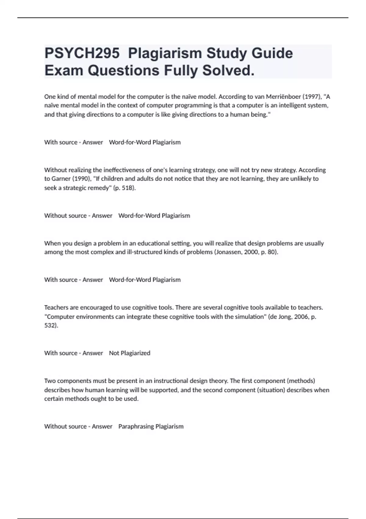 PSYCH295 Plagiarism Study Guide Exam Questions Fully Solved.