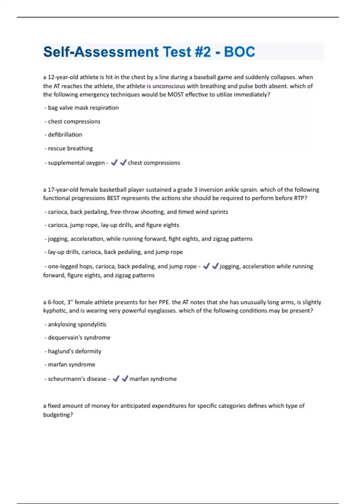 a 12-year-old athlete is hit in the chest by a line during a baseball game and suddenly collapses. when the AT reaches the athlete, the athlete is unconscious with breathing and pulse both absent. which of the following emergency techniques would be MOST effective to utilize immediately? - bag valve mask respiration - chest compressions - defibrillation - rescue breathing - supplemental oxygen - chest compressions a 17-year-old female basketball player sustained a grade 3 inversion ankle sprain. which of the following functional progressions BEST represents the actions she should be required to perform before RTP? - carioca, back pedaling, free-throw shooting, and timed wind sprints - carioca, jump rope, lay-up drills, and figure eights - jogging, acceleration, while running forward, fight eights, and zigzag patterns - lay-up drills, carioca, back pedaling, and jump rope - one-legged hops, carioca, back pedaling, and jump rope - jogging, acceleration while running forward, figure eights, and zigzag patterns a 6-foot, 3" female athlete presents for her PPE. the AT notes that she has unusually long arms, is slightly kyphotic, and is wearing very powerful eyeglasses. which of the following conditions may be present? - ankylosing spondylitis - dequervain's syndrome - haglund's deformity - marfan syndrome - scheurmann's disease - marfan syndrome a fixed amount of money for anticipated expenditures for specific categories defines which type of budgeting?- zero-based - variable - performance - lump-sum - line-item - lump=sum a hockey player reports to the AT complaining of right hip pain. the athlete indicates that the pain began approximately 3 weeks ago and is progressively increasing. the athlete has no prior history of hip injuries. the AT completes an initial evaluation of the athlete. initial observations: no atrophy or ecchymosis present right iliac crest and ASIS appear inferior pronated feet/pes planus genu varum apparant weight shift to the left side based on the s/s identified during the evaluation, which of the following conditions should the AT suspect? - abduction muscle strain - adductor muscle strain - femoral neck stress fracture - hip flexor strain - lumbar disk herniation - trochanteric bursitis - abduction muscle strain femoral neck stress fracture hip flexor strain a knee brace with a medial metal insert BEST prevents which type of force? - varus - valgus - shear- rotational - distraction - valgus a male athlete reports to the AT expressing concern for recent painful urinations with traces of blood and purulent discharge. there has been no recent trauma. to whom should the AT refer the athlete to for further evaluation? - oncologist - nephrologist - hematologist - gastroenterologist - family practice physician - family practice physician