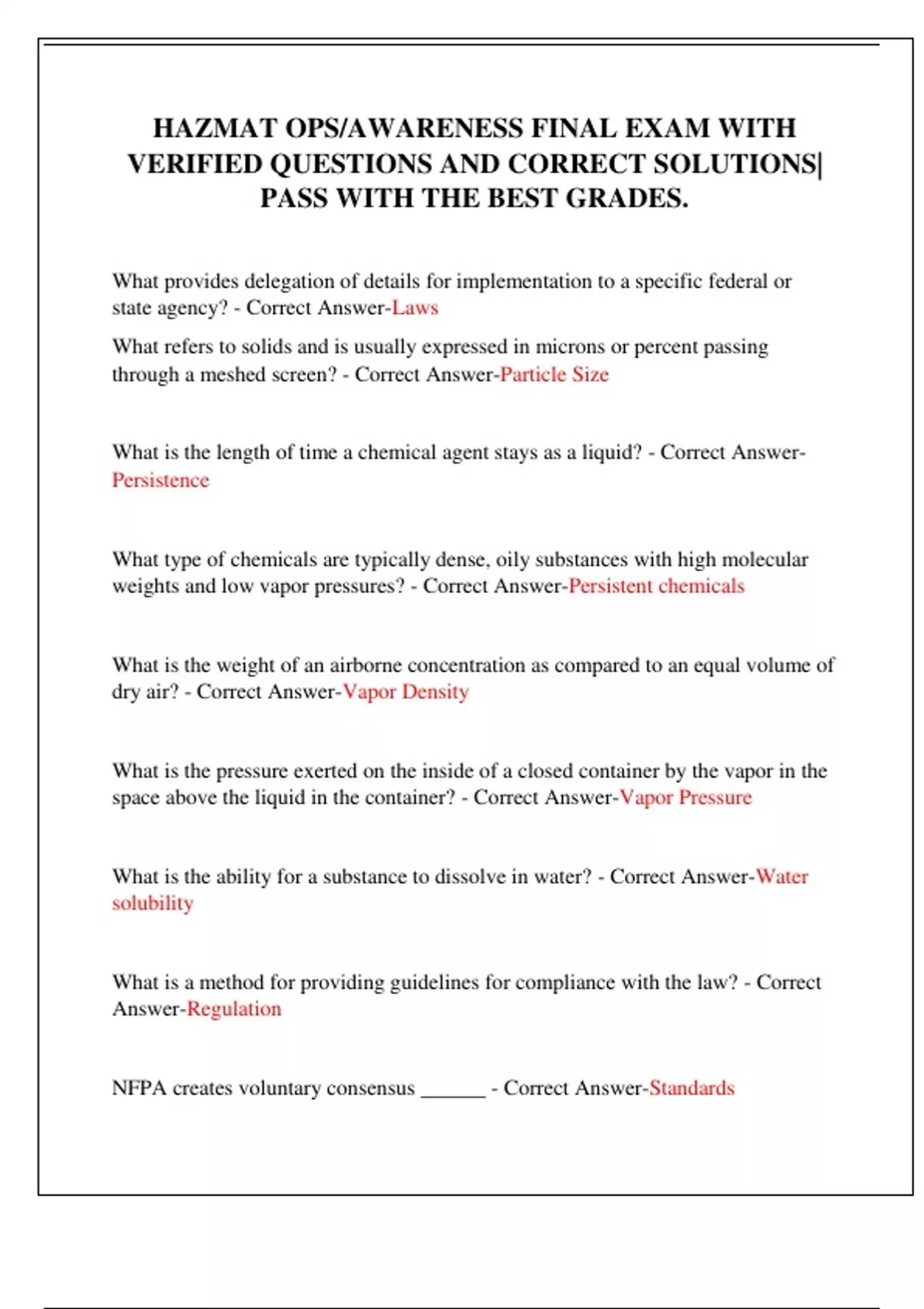 HAZMAT OPS/AWARENESS FINAL EXAM WITH VERIFIED QUESTIONS AND CORRECT SOLUTIONS| PASS WITH THE BEST GRADES.