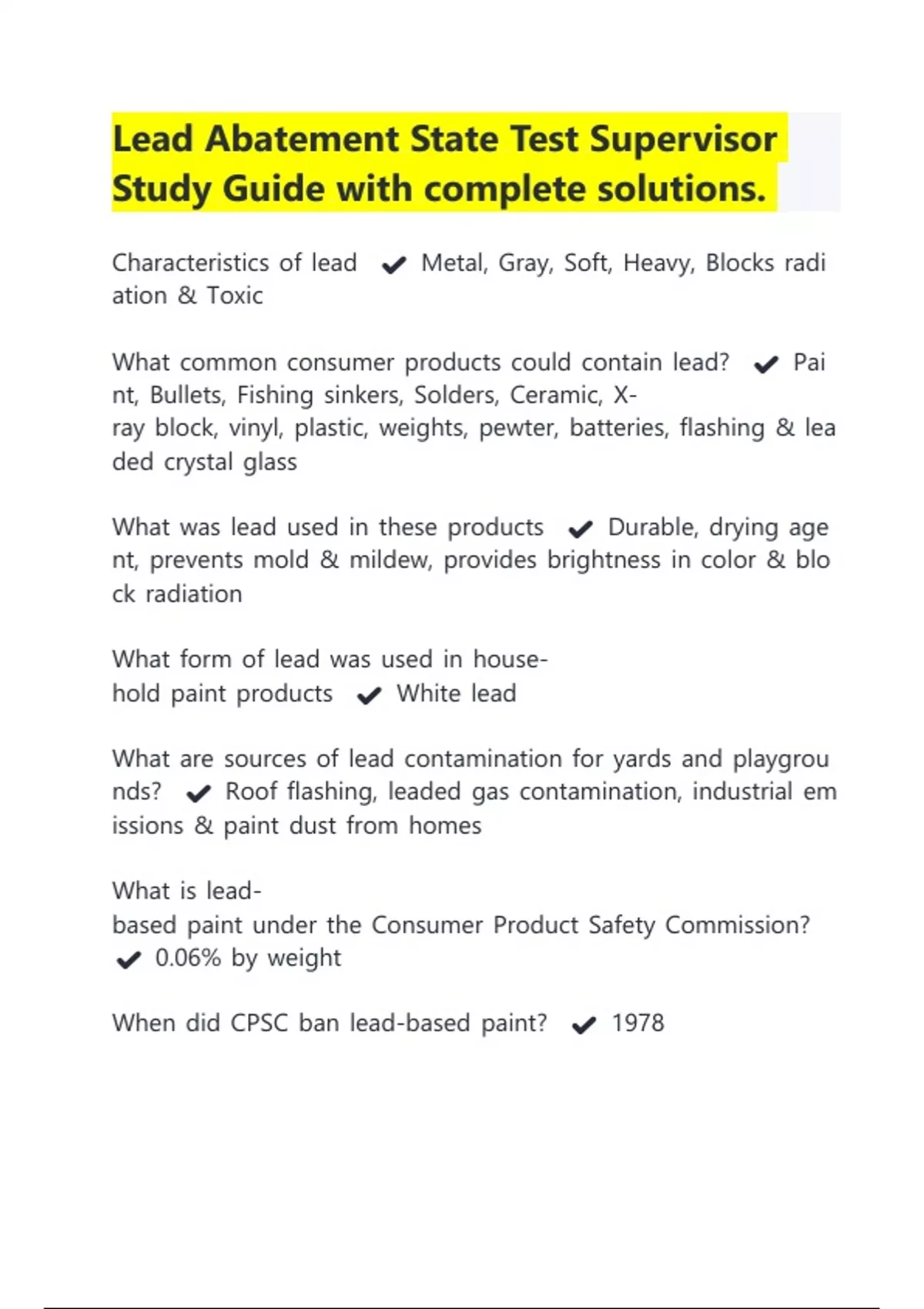 Lead Abatement State Test Supervisor Study Guide with complete solutions |Latest 2024/2025