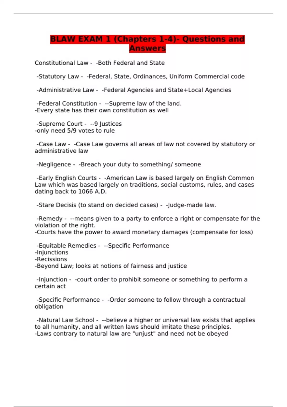 BLAW EXAM 1 (Chapters 1-4)- Questions and Answers