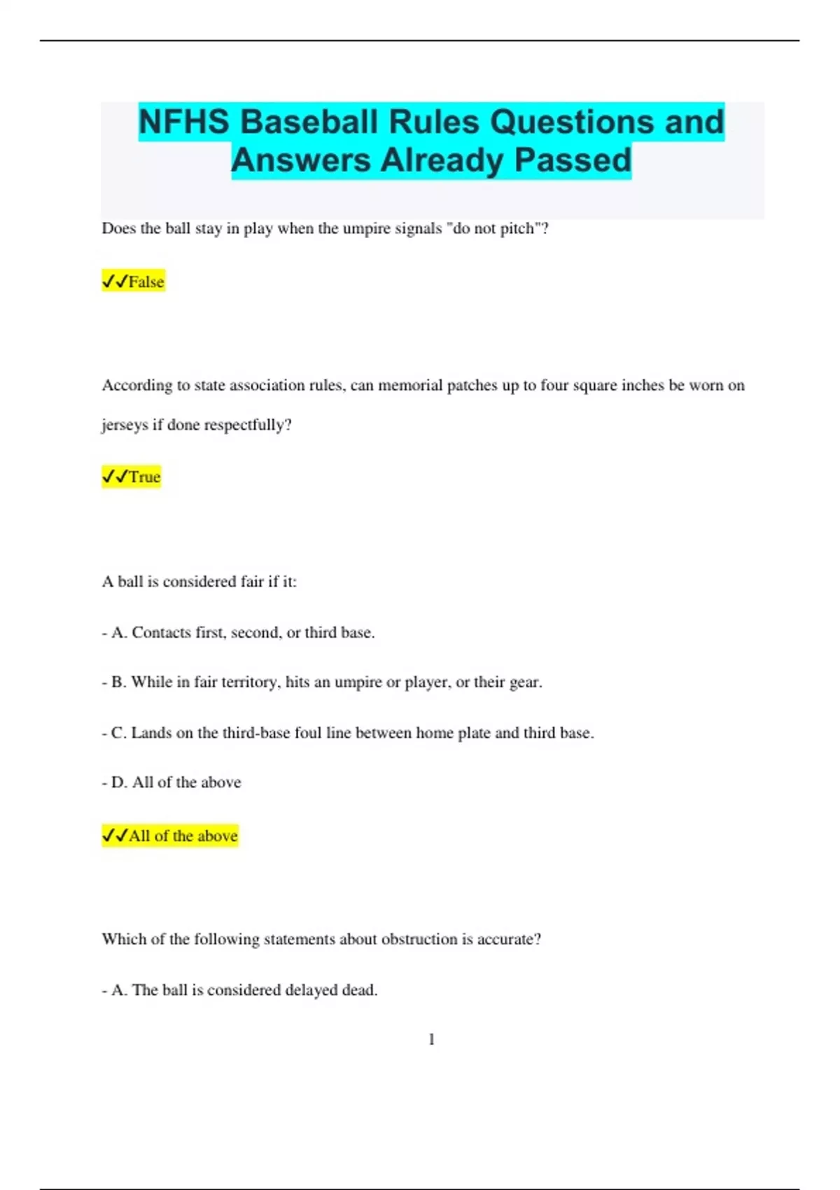NFHS Baseball Rules Questions and Answers Already Passed Does the ball stay in play when the umpire signals "do not pitch"? False According to state association rules, can memorial patches up to four square inches be worn on jerseys if done respectfully? True A ball is considered fair if it: - A. Contacts first, second, or third base. - B. While in fair territory, hits an umpire or player, or their gear. - C. Lands on the third-base foul line between home plate and third base. - D. All of the above All of the above Which of the following statements about obstruction is accurate? - A. The ball is considered delayed dead. 2 - B. The obstruction must be deliberate and solely physical. - C. It occurs when a fielder with the ball blocks a runner from reaching a base. - D. It is called when a fielder without the ball pretends to tag a runner. It is called when a fielder without the ball pretends to tag a runner. Regarding the identification of an illegal player, who can discover this? - A. Only an umpire. - B. Only the opposing team. - C. Only the player’s team. - D. Either an umpire or any team. Either an umpire or any team. An offensive conference is counted when: - A. A coach meets with a base runner after the opposing team has been granted a conference with their pitcher. - B. Time is given for an evidently injured player. - C. An assistant coach is given time to talk with a base runner on first base. - D. All of the above 3 An assistant coach is given time to talk with a base runner on first base. Can the same player be listed as both the pitcher and the designated hitter? No A player will be ejected on the first offense if: - A. They prepare to bat in the opposing team’s on-deck circle. - B. They leave their bench area with the intention of physical confrontation. - C. A coach uses replay equipment during the game for coaching purposes. - D. All of the above They leave their bench area with the intention of physical confrontation. At the time of the pitch, where must all fielders be, excluding the catcher who should be in the catcher’s box? - A. All fielders must have both feet in fair ground to be considered in fair ground. - B. All fielders are considered to be in fair