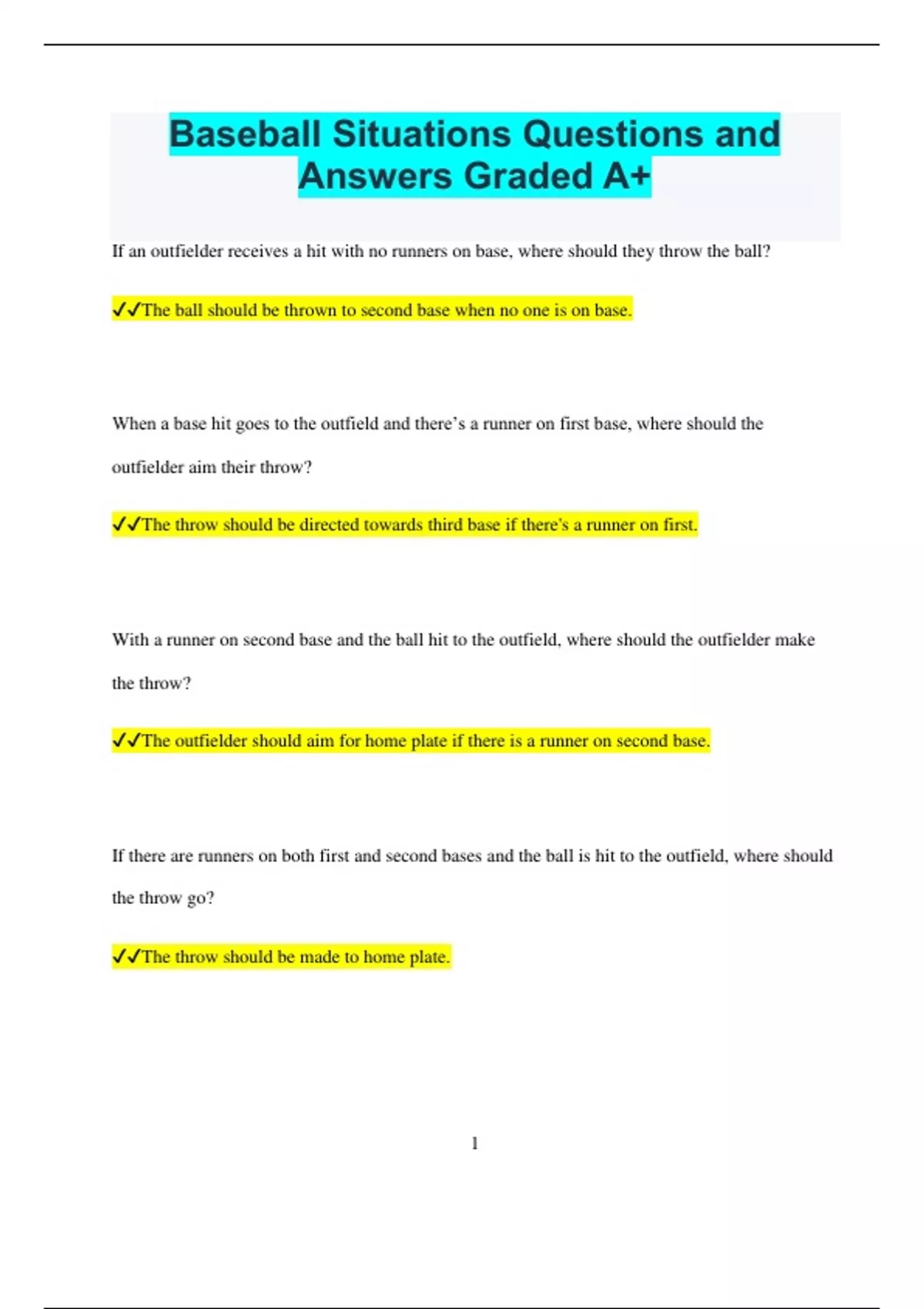 Baseball Situations Questions and Answers Graded A+ If an outfielder receives a hit with no runners on base, where should they throw the ball? The ball should be thrown to second base when no one is on base. When a base hit goes to the outfield and there’s a runner on first base, where should the outfielder aim their throw? The throw should be directed towards third base if there's a runner on first. With a runner on second base and the ball hit to the outfield, where should the outfielder make the throw? The outfielder should aim for home plate if there is a runner on second base. If there are runners on both first and second bases and the ball is hit to the outfield, where should the throw go? The throw should be made to home plate. 2 With less than two outs and runners on first and second bases, where should an outfielder throw the ball if a hit is made to the outfield? The outfielder should throw to home plate. The decision to continue the throw or make a play at a different base depends on the runners' movements. For a fly ball hit to the outfield with runners on first and second bases, what is the best strategy for the outfielder? The ideal play is to try for the lead runner at third base if the ball is hit deep enough. If not, the throw should be aimed at second base. With runners on first and third bases and a fly ball is hit to the outfield, where should the outfielder throw the ball? If there’s a chance to get the runner at home, the throw should go to home plate. Keep the throw low to allow the cutoff man to decide if the play should be made at home or at another base. What is the role of the first baseman for relays, cut-offs, and double cuts when a play involves a throw from right field? 3 The first baseman should position themselves near the catcher by moving towards home plate when the ball is hit to right field. Stand about 40 feet in front of the catcher with hands raised. If the play at home is not possible, only cut the ball if aiming for another base. How should the first baseman position themselves for a throw from center field with a play at home plate? The first baseman should stand on the second base side of the pitcher’s mound. This placement helps avoid interference from the mound and ensures better handling of the throw. Position at the mound’s base and adjust according to the situation. What is 1st baseman's role and positioning for relays, cut-offs, and double cuts. The first baseman is the cut-off man for plays at the plate from right field. What should the 1st baseman do? When a ball is hit to the right fielder, run toward the catcher and get into position as quick as possible. You want to be in a direct line from the outfielder to the catcher. Be about 40 feet in front of the catcher and put your hands up.