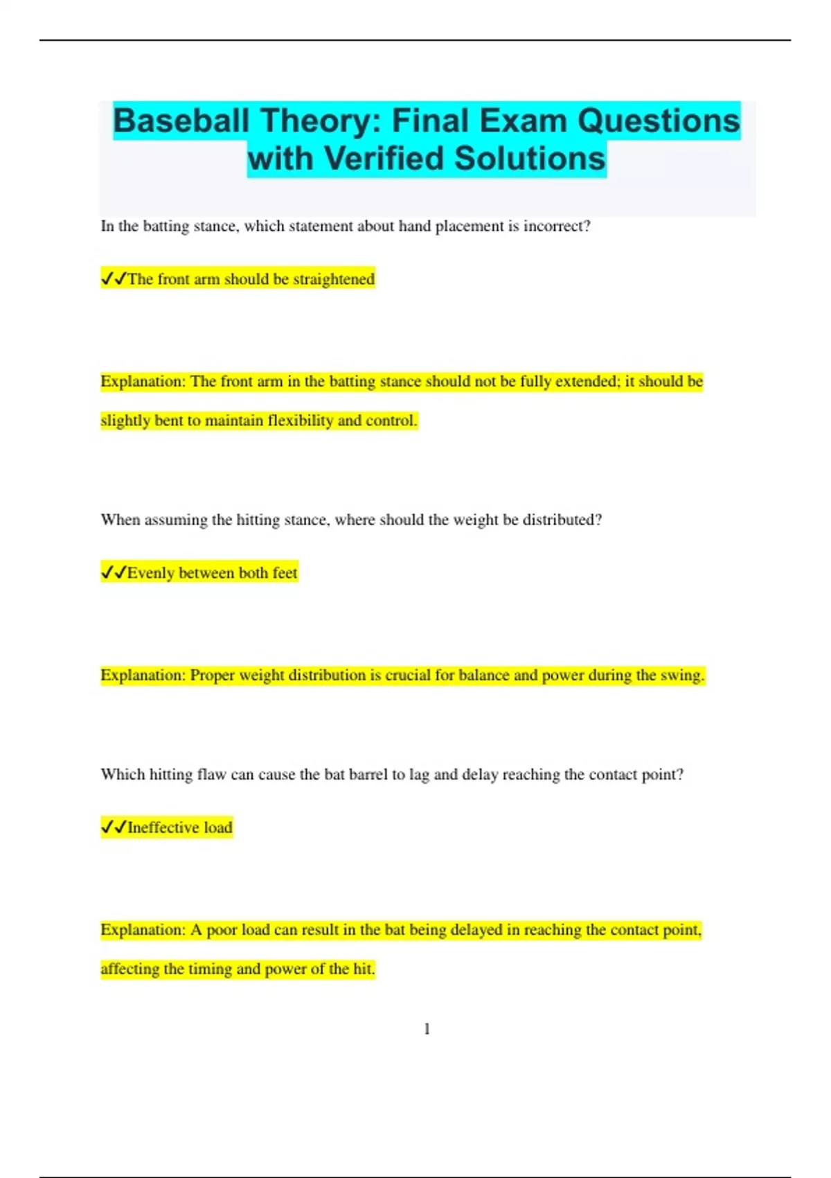 Baseball Theory: Final Exam Questions with Verified Solutions In the batting stance, which statement about hand placement is incorrect? The front arm should be straightened Explanation: The front arm in the batting stance should not be fully extended; it should be slightly bent to maintain flexibility and control. When assuming the hitting stance, where should the weight be distributed? Evenly between both feet Explanation: Proper weight distribution is crucial for balance and power during the swing. Which hitting flaw can cause the bat barrel to lag and delay reaching the contact point? Ineffective load Explanation: A poor load can result in the bat being delayed in reaching the contact point, affecting the timing and power of the hit. 2 At the moment of contact, which of the following is not correct? The front leg should be bent Explanation: The front leg is generally straightened to provide stability and power during contact. In bunting, what controls the direction of the bunt? The bottom hand Explanation: The bottom hand plays a crucial role in guiding the direction of the bunt. Regarding bunting, which statement is not accurate? You should hit the ball close to the body to slow it down Explanation: To effectively bunt, it's better to make contact with the ball away from the body to control its direction and speed. 3 What is the incorrect technique when running through first base? Step on top of the bag Explanation: The proper technique is to avoid stepping directly on top of the base; instead, you should run through it to avoid getting tagged out. When rounding the base, where should