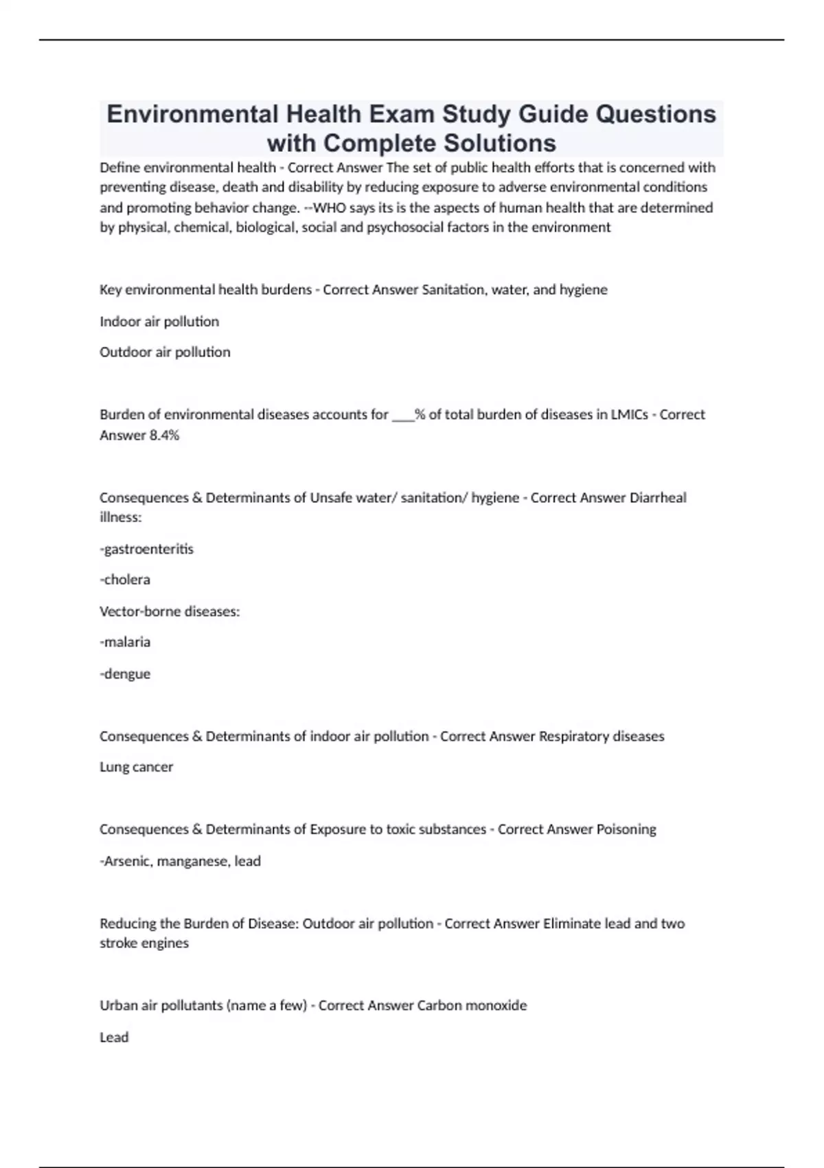 Environmental Health Exam Study Guide Questions with Complete Solutions