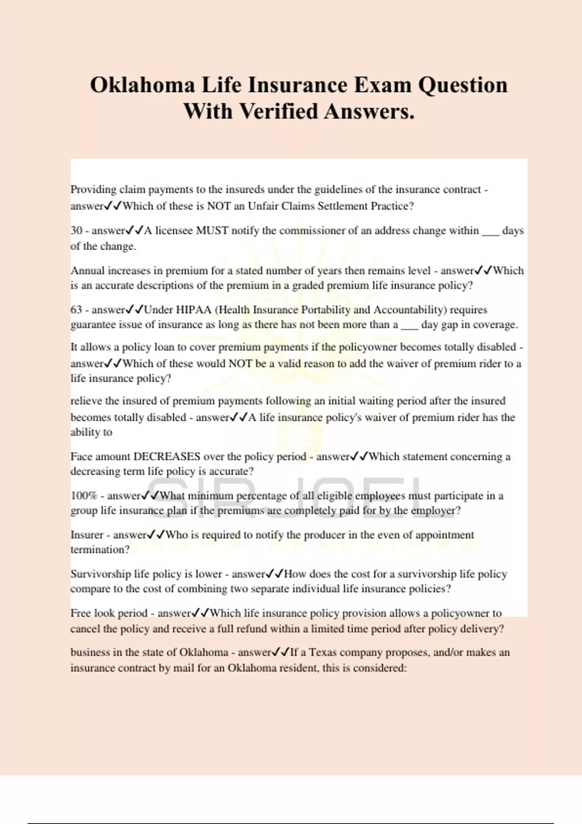 Oklahoma Life Insurance Exam Question With Verified Answers. Providing claim payments to the insureds under the guidelines of the insurance contract - answerWhich of these is NOT an Unfair Claims Settlement Practice? 30 - answerA licensee MUST notify the commissioner of an address change within ___ days of the change. Annual increases in premium for a stated number of years then remains level - answerWhich is an accurate descriptions of the premium in a graded premium life insurance policy? 63 - answerUnder HIPAA (Health Insurance Portability and Accountability) requires guarantee issue of insurance as long as there has not been more than a ___ day gap in coverage. It allows a policy loan to cover premium payments if the policyowner becomes totally disabled - answerWhich of these would NOT be a valid reason to add the waiver of premium rider to a life insurance policy? relieve the insured of premium payments following an initial waiting period after the insured becomes totally disabled - answerA life insurance policy's waiver of premium rider has the ability to Face amount DECREASES over the policy period - answerWhich statement concerning a decreasing term life policy is accurate? 100% - answerWhat minimum percentage of all eligible employees must participate in a group life insurance plan if the premiums are completely paid for by the employer? Insurer - answerWho is required to notify the producer in the even of appointment termination? Survivorship life policy is lower - answerHow does the cost for a survivorship life policy compare to the cost of combining two separate individual life insurance policies? Free look period - answerWhich life insurance policy provision allows a policyowner to cancel the policy and receive a full refund within a limited time period after policy delivery? business in the state of Oklahoma - answerIf a Texas company proposes, and/or makes an insurance contract by mail for an Oklahoma resident, this is considered: Eye examination - answerWhen an applicant applies for a large amount of life insurance coverage, which of the following would likely NOT be an underwriting requirement? Cash value - answerA source of supplemental income for a life insurance policyowner can be derived from the Give notice, explain, and allow opting out - answerWhen the disclosure of an insured's nonpublic information is involved, what is the insurer obligated to do? Determining the final rate classification - answerWhich of these is NOT an underwriting responsibility of a life insurance agent ? The premium to purchase the coverage comes from the policy's cash value - answerWhich of these statements regarding the extended term insurance nonforfeiture option in a life policy is accurate ? Lender - answerThe death proceeds of a credit life insurance policy are typically paid to the 6 months - answerHow long can an insurer legally defer paying the cash value of a surrendered life insurance policy? Reduced death benefit - answerWhat effect can a long term care benefit rider have on a life insurance policy? Misdemeanor conviction - answerWhich of the following actions by a producer would NOT result in a license suspension or revocation? Credit - answer_____ life insurance is designed to pay the balance of a loan if the insured dies before the loan has been repaid. When the initial premium has been paid with the application - answerWhen does the producer give a premium receipt for a life insurance application? to accumulate savings - answerWhich of these is NOT a reason to buy a term life policy? single premium deferred annuity - answerSylvia purchased an annuity for $100,000 from the proceeds of an inheritance. No further payments are permitted and the income stream begins in 15 years. This contract is a(n) Education - answerThe following is information that should be taken into consideration when making suitable recommendations concerning the purchase of insurance, EXCEPT 2 years - answerA life insurance policy becomes incontestable after it has been in force for As an optional policy rider - answerHow may an insurance company classify an accidental death benefit on a life policy?