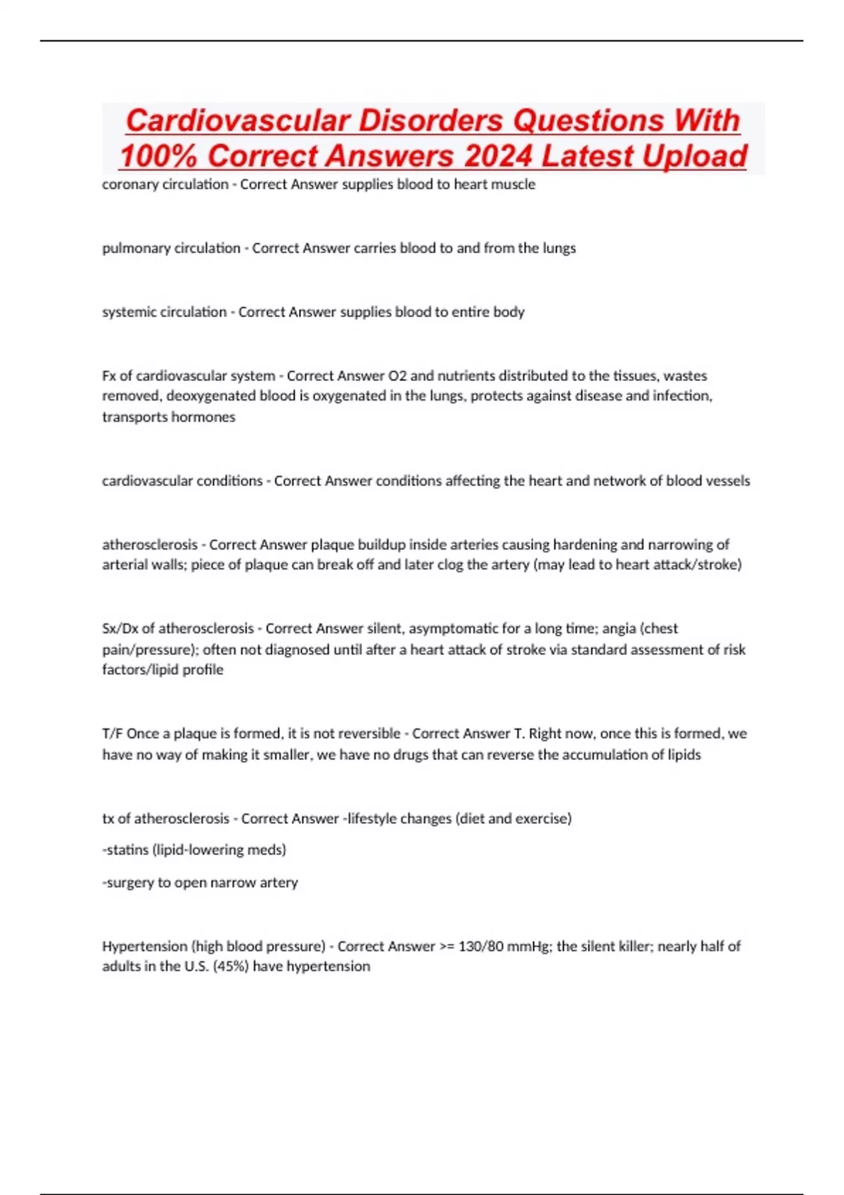 Cardiovascular Disorders Questions With 100% Correct Answers 2024 Latest Upload coronary circulation - Correct Answer supplies blood to heart muscle pulmonary circulation - Correct Answer carries blood to and from the lungs systemic circulation - Correct Answer supplies blood to entire body Fx of cardiovascular system - Correct Answer O2 and nutrients distributed to the tissues, wastes removed, deoxygenated blood is oxygenated in the lungs, protects against disease and infection, transports hormones cardiovascular conditions - Correct Answer conditions affecting the heart and network of blood vessels atherosclerosis - Correct Answer plaque buildup inside arteries causing hardening and narrowing of arterial walls; piece of plaque can break off and later clog the artery (may lead to heart attack/stroke) Sx/Dx of atherosclerosis - Correct Answer silent, asymptomatic for a long time; angia (chest pain/pressure); often not diagnosed until after a heart attack of stroke via standard assessment of risk factors/lipid profile T/F Once a plaque is formed, it is not reversible - Correct Answer T. Right now, once this is formed, we have no way of making it smaller, we have no drugs that can reverse the accumulation of lipids tx of atherosclerosis - Correct Answer -lifestyle changes (diet and exercise) -statins (lipid-lowering meds) -surgery to open narrow artery Hypertension (high blood pressure) - Correct Answer >= 130/80 mmHg; the silent killer; nearly half of adults in the U.S. (45%) have hypertension