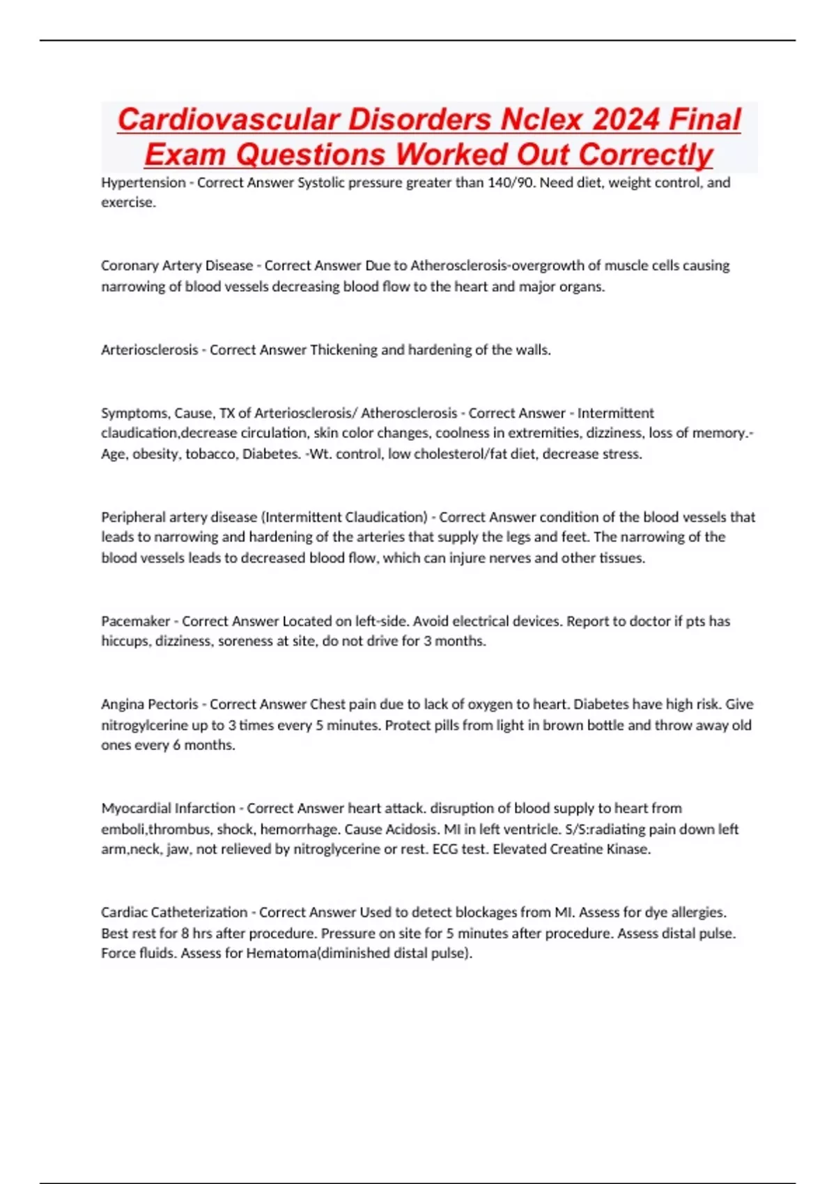 Cardiovascular Disorders Nclex 2024 Final Exam Questions Worked Out Correctly Hypertension - Correct Answer Systolic pressure greater than 140/90. Need diet, weight control, and exercise. Coronary Artery Disease - Correct Answer Due to Atherosclerosis-overgrowth of muscle cells causing narrowing of blood vessels decreasing blood flow to the heart and major organs. Arteriosclerosis - Correct Answer Thickening and hardening of the walls. Symptoms, Cause, TX of Arteriosclerosis/ Atherosclerosis - Correct Answer - Intermittent claudication,decrease circulation, skin color changes, coolness in extremities, dizziness, loss of memory.- Age, obesity, tobacco, Diabetes. -Wt. control, low cholesterol/fat diet, decrease stress. Peripheral artery disease (Intermittent Claudication) - Correct Answer condition of the blood vessels that leads to narrowing and hardening of the arteries that supply the legs and feet. The narrowing of the blood vessels leads to decreased blood flow, which can injure nerves and other tissues. Pacemaker - Correct Answer Located on left-side. Avoid electrical devices. Report to doctor if pts has hiccups, dizziness, soreness at site, do not drive for 3 months. Angina Pectoris - Correct Answer Chest pain due to lack of oxygen to heart. Diabetes have high risk. Give nitrogylcerine up to 3 times every 5 minutes. Protect pills from light in brown bottle and throw away old ones every 6 months. Myocardial Infarction - Correct Answer heart attack. disruption of blood supply to heart from emboli,thrombus, shock, hemorrhage. Cause Acidosis. MI in left ventricle. S/S:radiating pain down left arm,neck, jaw, not relieved by nitroglycerine or rest. ECG test. Elevated Creatine Kinase. Cardiac Catheterization - Correct Answer Used to detect blockages from MI. Assess for dye allergies. Best rest for 8 hrs after procedure. Pressure on site for 5 minutes after procedure. Assess distal pulse. Force fluids. Assess for Hematoma(diminished distal pulse).