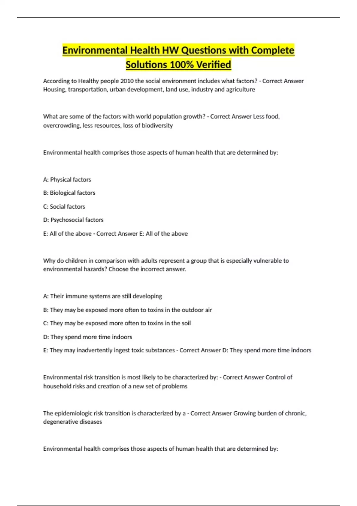 Environmental Health HW Questions with Complete Solutions 100% Verified According to Healthy people 2010 the social environment includes what factors? - Correct Answer Housing, transportation, urban development, land use, industry and agriculture What are some of the factors with world population growth? - Correct Answer Less food, overcrowding, less resources, loss of biodiversity Environmental health comprises those aspects of human health that are determined by: A: Physical factors B: Biological factors C: Social factors D: Psychosocial factors E: All of the above - Correct Answer E: All of the above Why do children in comparison with adults represent a group that is especially vulnerable to environmental hazards? Choose the incorrect answer. A: Their immune systems are still developing B: They may be exposed more often to toxins in the outdoor air C: They may be exposed more often to toxins in the soil D: They spend more time indoors E: They may inadvertently ingest toxic substances - Correct Answer D: They spend more time indoors Environmental risk transition is most likely to be characterized by: - Correct Answer Control of household risks and creation of a new set of problems The epidemiologic risk transition is characterized by a - Correct Answer Growing burden of chronic, degenerative diseases Environmental health comprises those aspects of human health that are determined by: