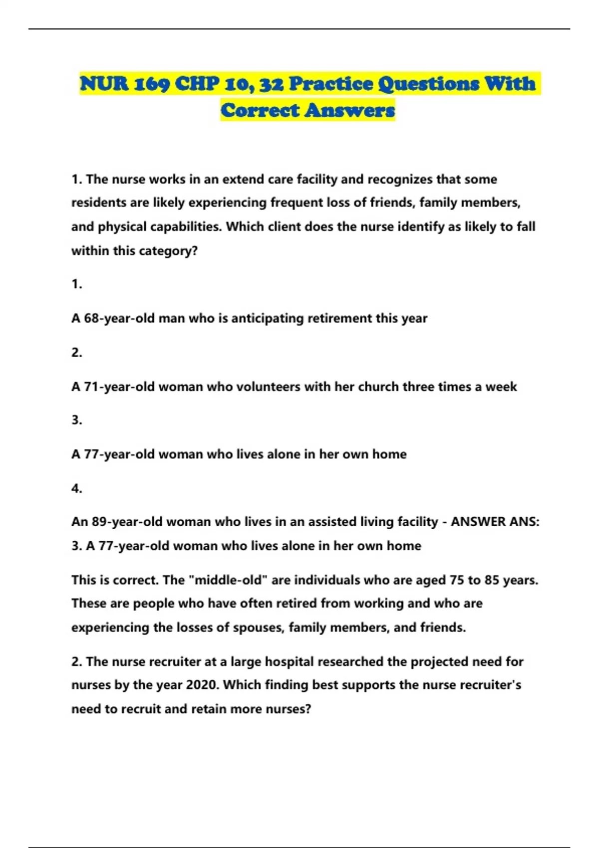 NUR 169 CHP 10, 32 Pr acti ce Q uestions With Correct An swers 1. The nurse works in an extend care facility and recognizes that some residents are likely experiencing frequent loss of friends, family members, and physical capabilities. Which client does the nurse identify as likely to fall within this category? 1. A 68-year-old man who is anticipating retirement this year 2. A 71-year-old woman who volunteers with her church three times a week 3. A 77-year-old woman who lives alone in her own home 4. An 89-year-old woman who lives in an assisted living facility - ANSWER ANS: 3. A 77-year-old woman who lives alone in her own home This is correct. The "middle-old" are individuals who are aged 75 to 85 years. These are people who have often retired from working and who are experiencing the losses of spouses, family members, and friends. 2. The nurse recruiter at a large hospital researched the projected need for nurses by the year 2020. Which finding best supports the nurse recruiter's need to recruit and retain more nurses? 1. The birth rates are likely to continue to drop due to the aging of society. 2. Eight and one-half percent of people worldwide are age 65 and older. 3. The number of centurions increases steadily due to better health care. 4. The supply of nurses will fall more than one million below the need. - ANSWER ANS: 4 The supply of nurses will fall more than one million below the need. This is correct. The number of nurses who practice is decreasing because of the increased age of nurses in general. Because greater numbers of nurses are going to be needed to care for the aging population, this finding best supports the need to recruit and retain nurses. 3. A nurse is notified that a new admission is expected to the unit. The nurse is told that the client is 101 years old and is being admitted from a nearby extended care facility. Which assumption about the client's need is appropriate? 1. The client will be blind. 2. The client's risk for falls will be high. 3. The client will be confused. 4. The client will need complete care. - ANSWER ANS: 2. The client's risk for falls will be high. This is correct. Nursing care should always be personalized and based on the needs of the individual, not on assumptions about a person based on age. Fall risk is a safety concern, so this is the most appropriate assumption to ensure safety. 4. The nurse is approached by a resident in a long-term care facility. The client is considered to be middle-old, walks with a cane, has notable facial droop, and takes a long time to formulate verbal expression. Which is the best response by the nurse? 1. Face the individual and directly ask, "What can I do for you?" 2. Loudly assess for the client's need by saying, "What do you need?" 3. Use hand motions and ask, "Are you hungry, thirsty, or in pain?" 4. Make eye contact, and say, "I'll have the aide come to your room in a minute." - ANSWER ANS: 1. Face the individual and directly ask, "What can I do for you?" This is correct. When communicating with an individual who may have had a cerebrovascular accident or is dealing with other manifestations of aging, the nurse should speak slowly, face the client, and allow plenty of time for the client to respond. 5. The nurse is offering support to a family member who is caring for a client diagnosed with Alzheimer disease. Which comment by the family member does the nurse recognize as a possible contributor for client abuse? 1. "It is just a turnabout. First she cared for me, and now I care for her." 2. "What makes me crazy is the wandering at night. I try to keep her safe." 3. "Poor mother, she doesn't know who we are and can't even talk to us." 4. "I feel like I am caring for a stranger; I don't relate to this person at all." - ANSWER ANS: "I feel like I am caring for a stranger; I don't relate to this person at all." This is correct. Caring for a client with Alzheimer disease is very stressful for the caregiver. When the client loses personality characteristics and is unable to identify family members, the caregiver may also lose emotional attachment with the client. This is the statement that the nurse can identify as a possible indicator for client abuse.