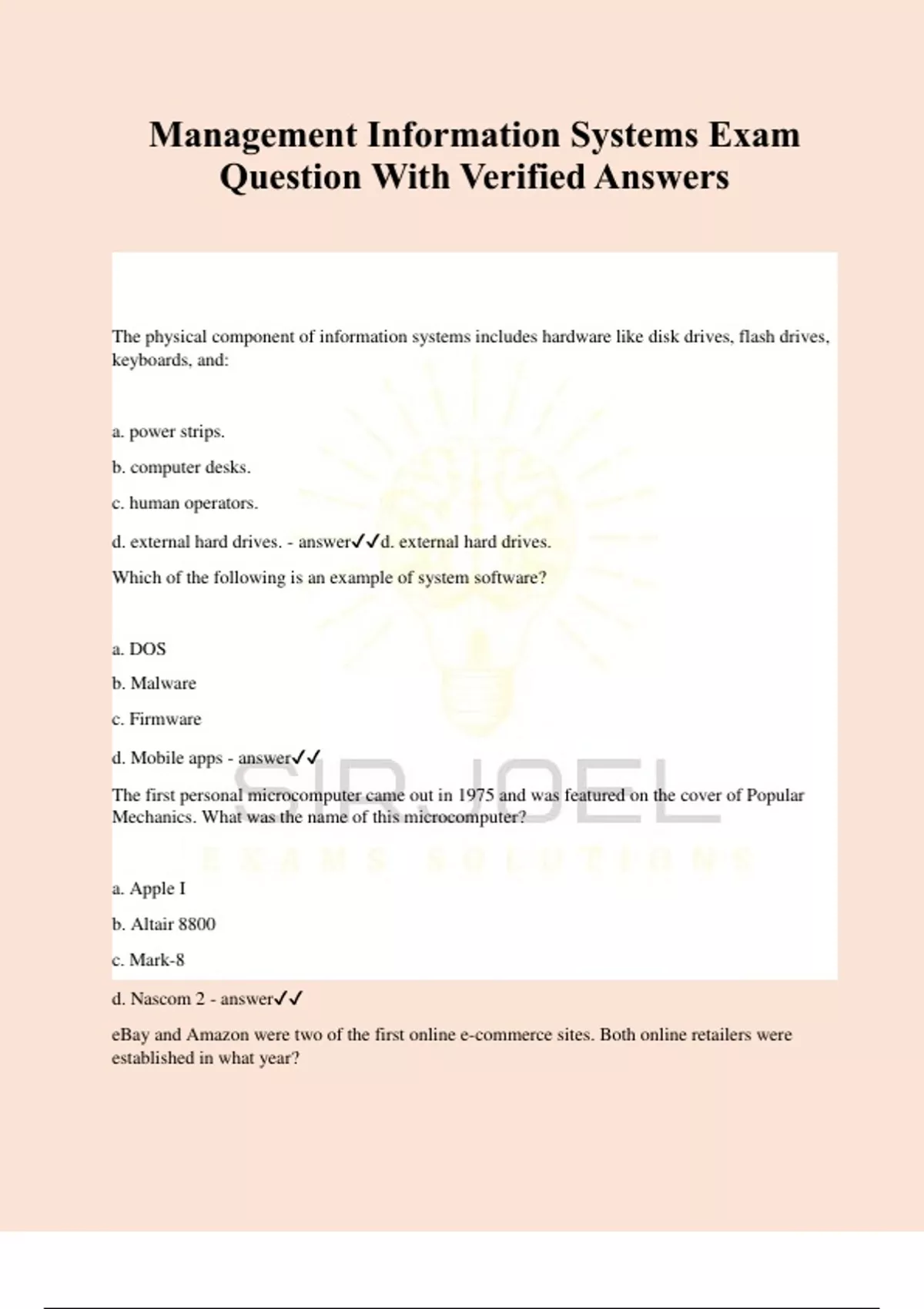Management Information Systems Exam Question With Verified Answers The physical component of information systems includes hardware like disk drives, flash drives, keyboards, and: a. power strips. b. computer desks. c. human operators. d. external hard drives. - answerd. external hard drives. Which of the following is an example of system software? a. DOS b. Malware c. Firmware d. Mobile apps - answer The first personal microcomputer came out in 1975 and was featured on the cover of Popular Mechanics. What was the name of this microcomputer? a. Apple I b. Altair 8800 c. Mark-8 d. Nascom 2 - answer eBay and Amazon were two of the first online e-commerce sites. Both online retailers were established in what year? a. 1993 b. 1994 c. 1996 d. 1997 - answerb. 1994 During which era did mainframe computers become a way to perform efficient calculations? a. Late 1950s to 1960s b. Mid 1960s to late 1970s c. Early 1970s to late 1980s d. Mid 1970s to early 1980s - answera. Late 1950s to 1960s Which of the following is a point for deliberation for organizations when creating a plan for digital transformation? a. Top down b. External consulting c. Engage market trends d. Software development for the infrastructure - answer RAM is installed in a computer through the use of a: a. DIMM. b. DNS. c. hard disk. d. motherboard - answera. DIMM. What "killer" spreadsheet application was the first of its kind to turn the microcomputer from a hobby to a major business tool in 1979? a. BYTE b. EasyWriter c. VisiCalc d. WordStar - answerc. VisiCalc Which of the following is an advantage of cloud computing for business? a. Rigid cost structure b. Off-premises servers c. Opportunity to monetize d. Non-negotiable agreements - answerb. Off-premises servers Which of the following advantages does closed source software have over open source software? a. Patches and additional features are available free. b. Application code can be reviewed before you install it. c. The company that developed the software offers technical support. d. More closed source applications exist for mobile apps than open source applications. - answerc. The company that developed the software offers technical support. ___________ assures information has not been altered in any unauthorized or unexpected way. a. Availability b. Confidentiality c. Integrated d. Integrity - answerd. Integrity Access control limits what information a user is allowed to read, ___________, add, and delete. a. create b. modify c. observe d. save - answerb. modify The process of encoding data upon its storage or transmission is called: