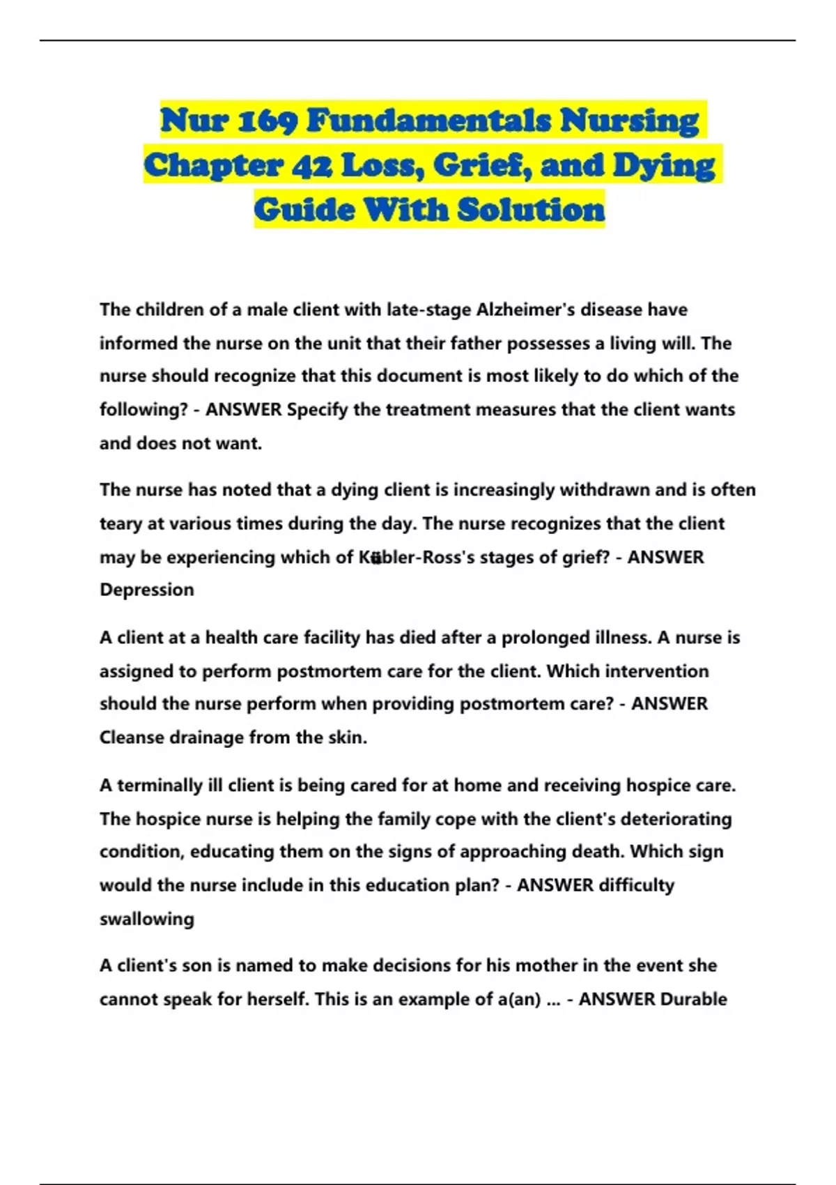 Nur 169 Fundamentals Nursing Chapter 42 Loss, Grief, and Dying Guide With Solution...