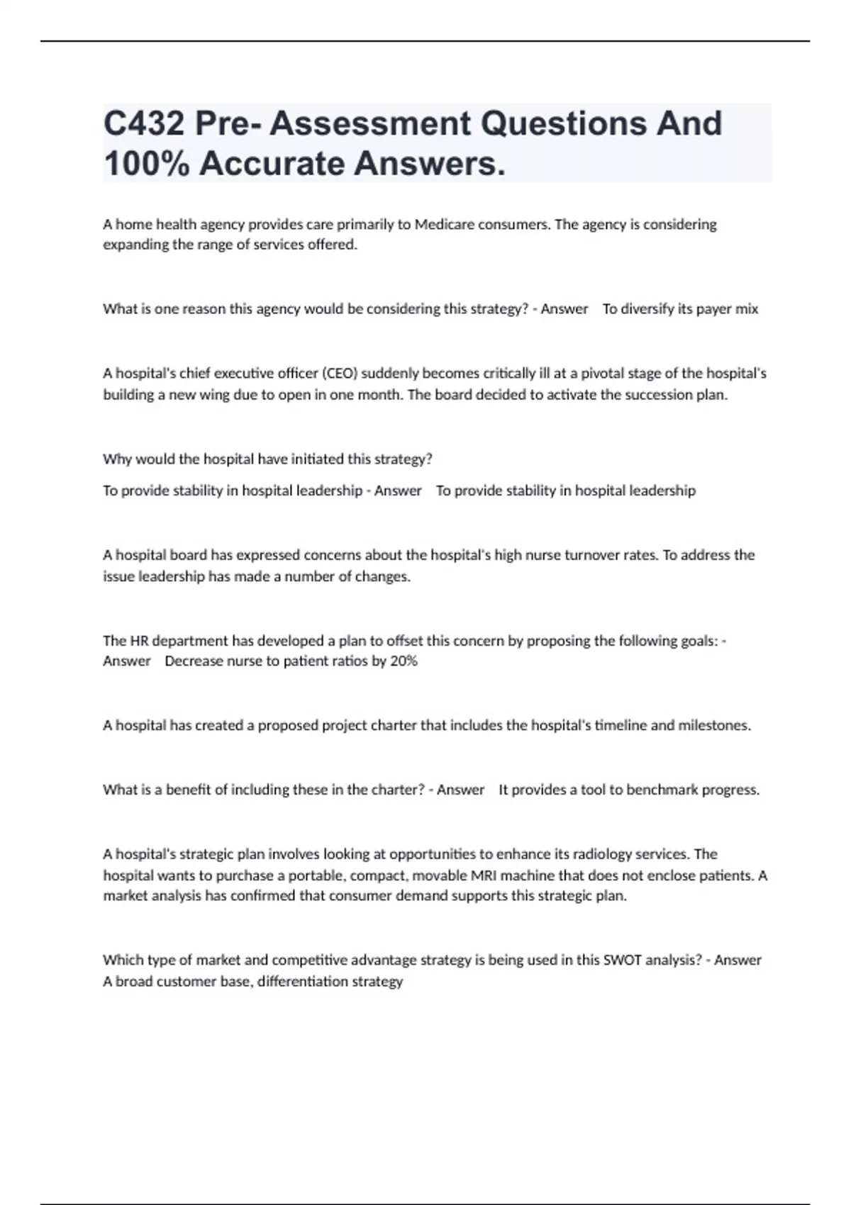 A home health agency provides care primarily to Medicare consumers. The agency is considering expanding the range of services offered. What is one reason this agency would be considering this strategy? - Answer To diversify its payer mix A hospital's chief executive officer (CEO) suddenly becomes critically ill at a pivotal stage of the hospital's building a new wing due to open in one month. The board decided to activate the succession plan. Why would the hospital have initiated this strategy? To provide stability in hospital leadership - Answer To provide stability in hospital leadership A hospital board has expressed concerns about the hospital's high nurse turnover rates. To address the issue leadership has made a number of changes. The HR department has developed a plan to offset this concern by proposing the following goals: - Answer Decrease nurse to patient ratios by 20% A hospital has created a proposed project charter that includes the hospital's timeline and milestones. What is a benefit of including these in the charter? - Answer It provides a tool to benchmark progress. A hospital's strategic plan involves looking at opportunities to enhance its radiology services. The hospital wants to purchase a portable, compact, movable MRI machine that does not enclose patients. A market analysis has confirmed that consumer demand supports this strategic plan. Which type of market and competitive advantage strategy is being used in this SWOT analysis? - Answer A broad customer base, differentiation strategy