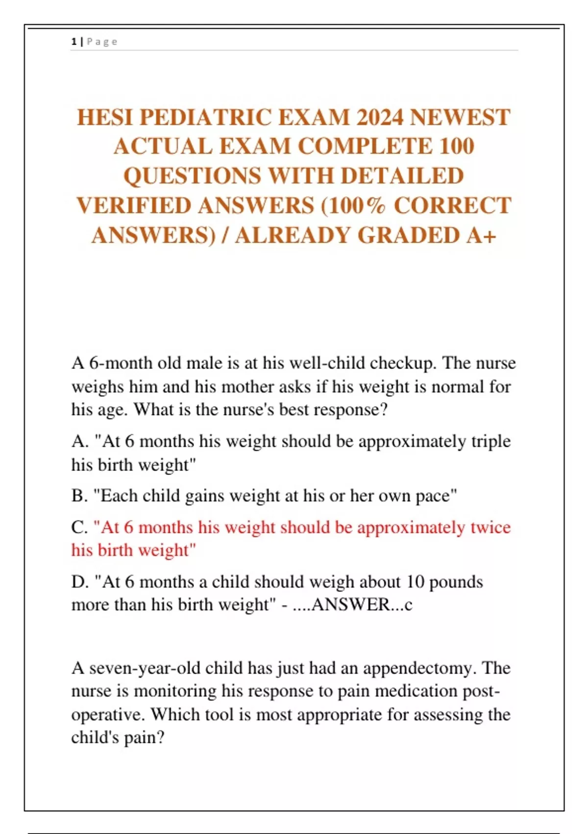 HESI PEDIATRIC EXAM 2024 NEWEST ACTUAL EXAM COMPLETE 100 QUESTIONS WITH DETAILED VERIFIED ANSWERS (100% CORRECT ANSWERS) / ALREADY GRADED A+