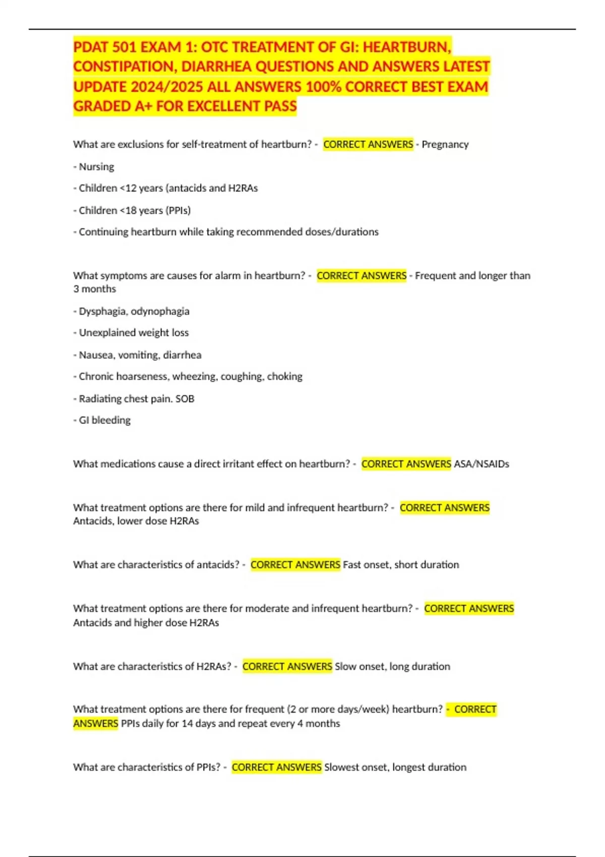 PDAT 501 EXAM 1: OTC TREATMENT OF GI: HEARTBURN, CONSTIPATION, DIARRHEA QUESTIONS AND ANSWERS LATEST UPDATE 2024/2025 ALL ANSWERS 100% CORRECT BEST EXAM GRADED A+ FOR EXCELLENT PASS
