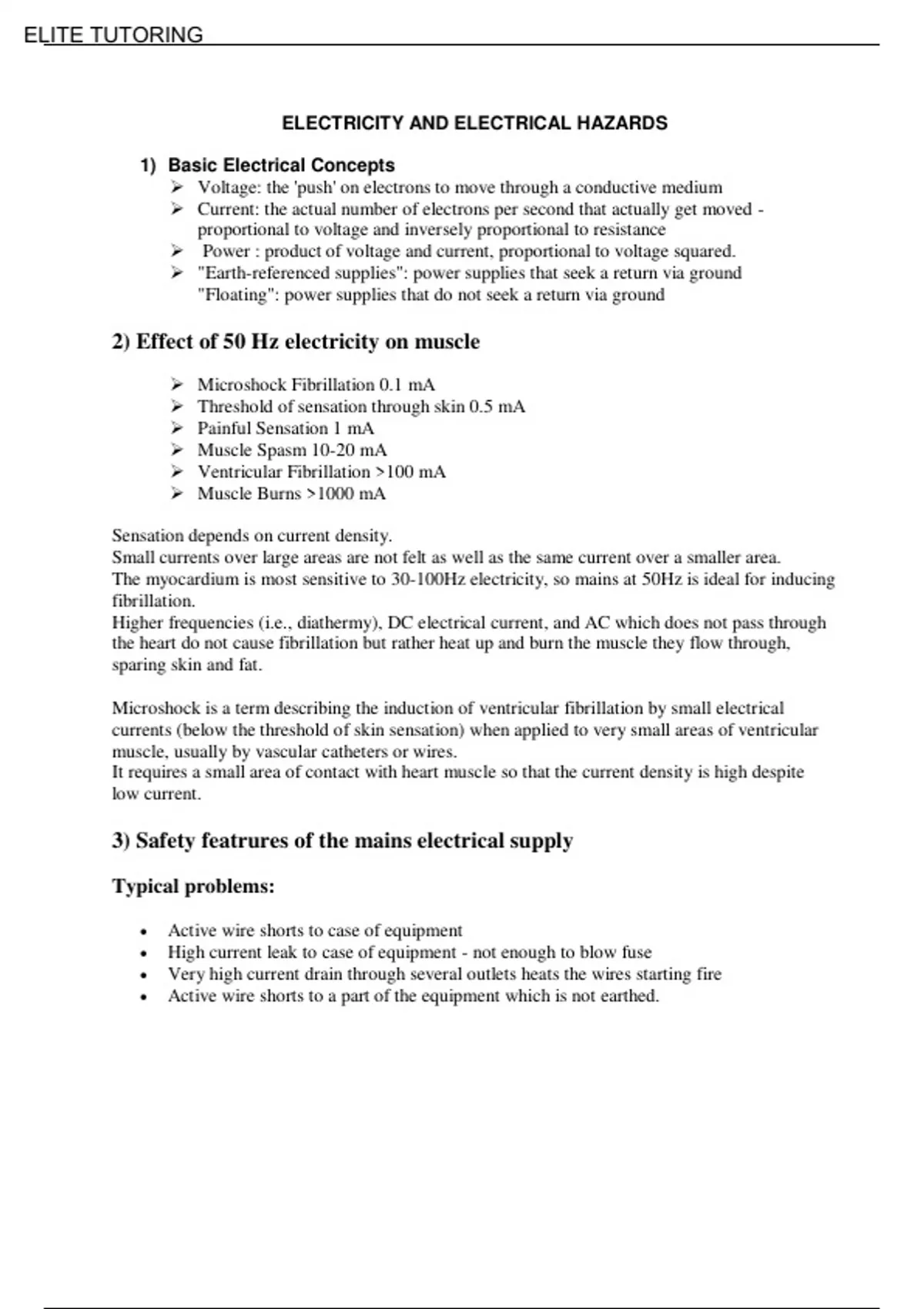 Summary ELECTRICITY AND ELECTRICAL HAZARDS