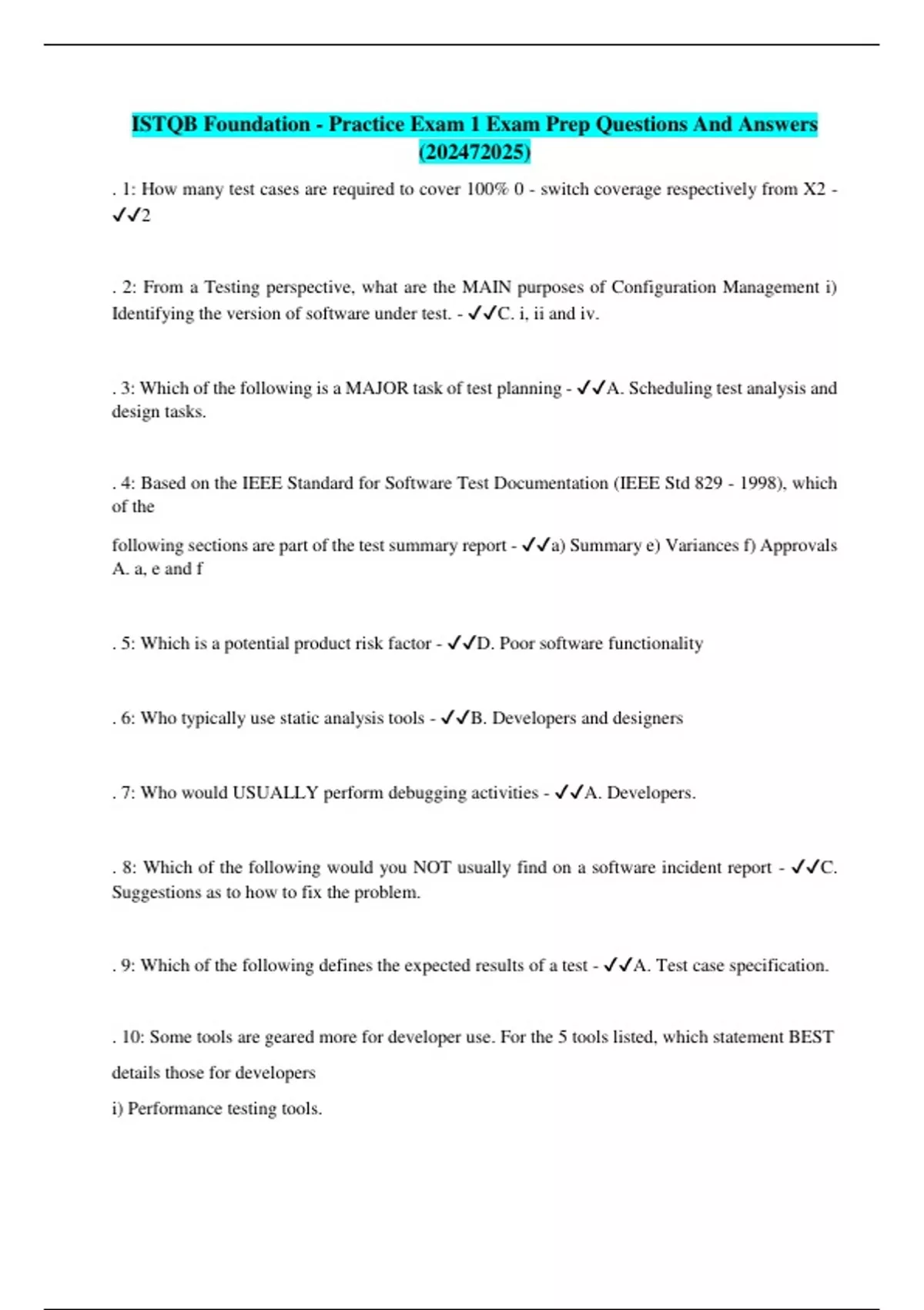 ISTQB Foundation - Practice Exam 1 Exam Prep Questions And Answers (202472025) . 1: How many test case s are required to cover 100% 0 - switch coverage respectively from X2 - ✔✔2 . 2: From a Testing perspective, what are the MAIN purposes of Configuration Management i) Identifying the version of software under test. - ✔✔C. i, ii and iv. . 3: Which of the following is a MAJOR task of test planning - ✔✔A. Scheduling test analysis and design tasks. . 4: Based on the IEEE Standard for Software Test Documentation (IEEE Std 829 - 1998), which of the following sections are part of the test summary report - ✔✔a) Summary e) Variances f) Approvals A. a, e and f . 5: Which is a potential product risk factor - ✔✔D. Poor software functionality . 6: Who typically use static analysis tools - ✔✔B. Developers and designers . 7: Who would USUALLY perform debugging activities - ✔✔A. Developers. . 8: Which of the following would you NOT usually find on a software incident report - ✔✔C. Suggestions as to how to fix the problem. . 9: Which of the following defines the expected results of a test - ✔✔A. Test case specification. . 10: Some tools are geared more for developer use. For the 5 tools listed, which statement BEST details those for developers i) Performance testing tools. ii) Coverage measurement tools. iii) Test compara tors. iv) Dynamic analysis tools. v) Incident management tools. - ✔✔A. i, iii. and iv. are more for developers. B. ii. and iv. are more for developers. C. ii, iii and iv. are more for developers. D. ii. and iii. are more for developers. result: - B . 11: Which of the following is correct - ✔✔A. Impact analysis assesses the effect on the system of a defect found in regression testing. B. Impact analysis assesses the effect of a new person joining the regression test team. C. Impact analysis assesses whether or not a defect found in regression testing has been fixed correctly. D. Impact analysis assesses the effect of a change to the system to determine how much regression testing to do. color=#800000 size=2 face=Arial> result: - D . 12: In software testing what is the main purpose of exit criteria - ✔✔A. To enhance the security of the system B. To prevent the endless loops in code. C. To swerve as an alternative or "Plan -B" D. To define when to stop testing result: - D . 13: Given the following state transition diagram Which of the following series of state transitions contains an INVALID transition which may indicate a fault in the system design - ✔✔Exhibit: A. Login Browse Basket Checkout Basket Checkout Pay Logout. B. Login Brows e Basket Checkout Pay Logout. C. Login Browse Basket Checkout Basket Logout. D. Login Browse Basket Browse Basket Checkout Pay Logout. result: - C . 14: Which of the following is a KEY test closure task - ✔✔A. Ensuring proper environment setup B. Writing a test summary report C. Assessing the need for additional tests D. Finalizing and archiving testware. result: - D . 15: What is beta testing - ✔✔A. Testing performed by potential customers at the developers location. B. Testing performed by potential cus tomers at their own locations. C. Testing performed by product developers at the customer's location. D. Testing performed by product developers at their own locations. result: - B . 16: Given the following fragment of code, how many tests are required for 100% decision coverage - ✔✔if width > length then biggest_dimension = width if height > width then biggest_dimension = height end_if else biggest_dimension = length if height > len gth then biggest_dimension = height end_if end_if A. 3 B. 4 C. 2 D. 1 result: - B . 17: You have designed test cases to provide 100% statement and 100% decision coverage for the following fragment of code. if width > length then biggest_dimension = width else biggest_dimension = length end_if The following has been added to the bottom of the code fragment above. print "Biggest dimension is " & biggest_dimension print "Width: " & width print "Length: " & length How many more test cases are required - ✔✔A. One more test case will be required for 100 % decision coverage. B. Two more test cases will be required for 100 % statement coverage, one of which will be used to provide 100% decision coverage.