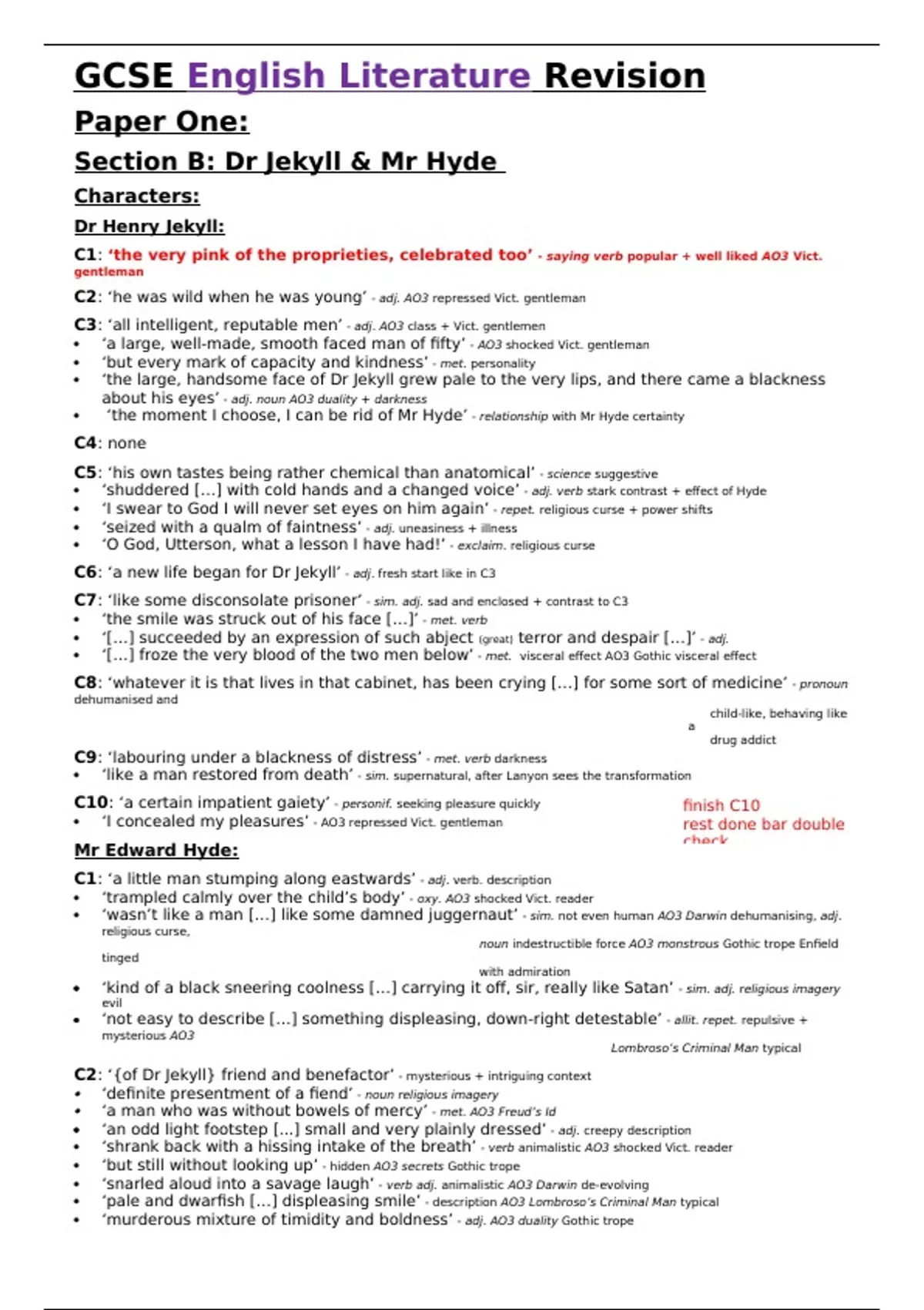 Summary GCSE English Literature Dr Jekyll and Mr Hyde Character Quotes from an Grade 9 student