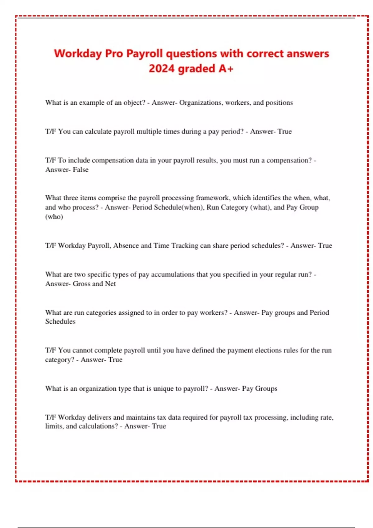 Workday Pro Payroll questions with correct answers 2024 graded A+ What is an example of an object? - Answer- Organizations, workers, and positions T/F You can calculate payroll multiple times during a pay period? - Answer- True T/F To include compensation data in your payroll results, you must run a compensation? - Answer- False What three items comprise the payroll processing framework, which identifies the when, what, and who process? - Answer- Period Schedule(when), Run Category (what), and Pay Group (who)