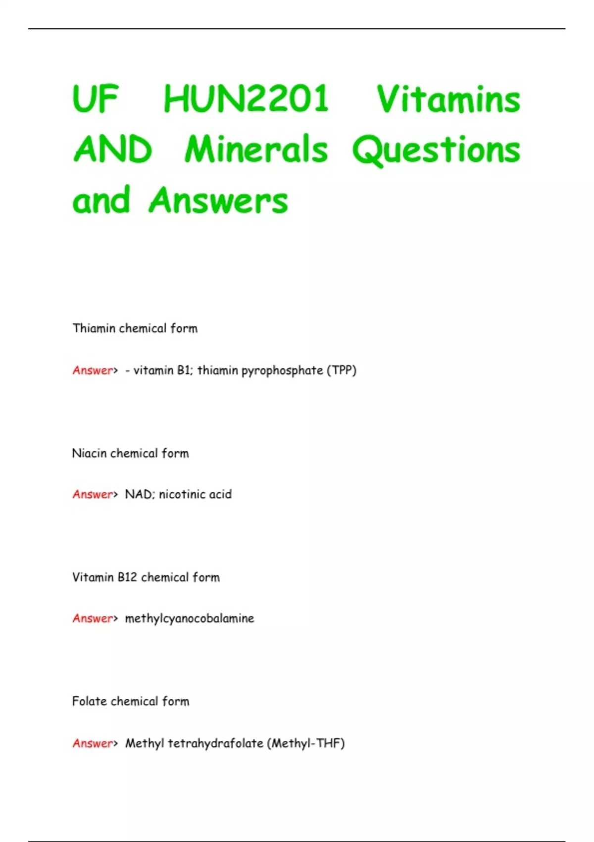 UF HUN2201 Vitamins AND Minerals Questions and Answers