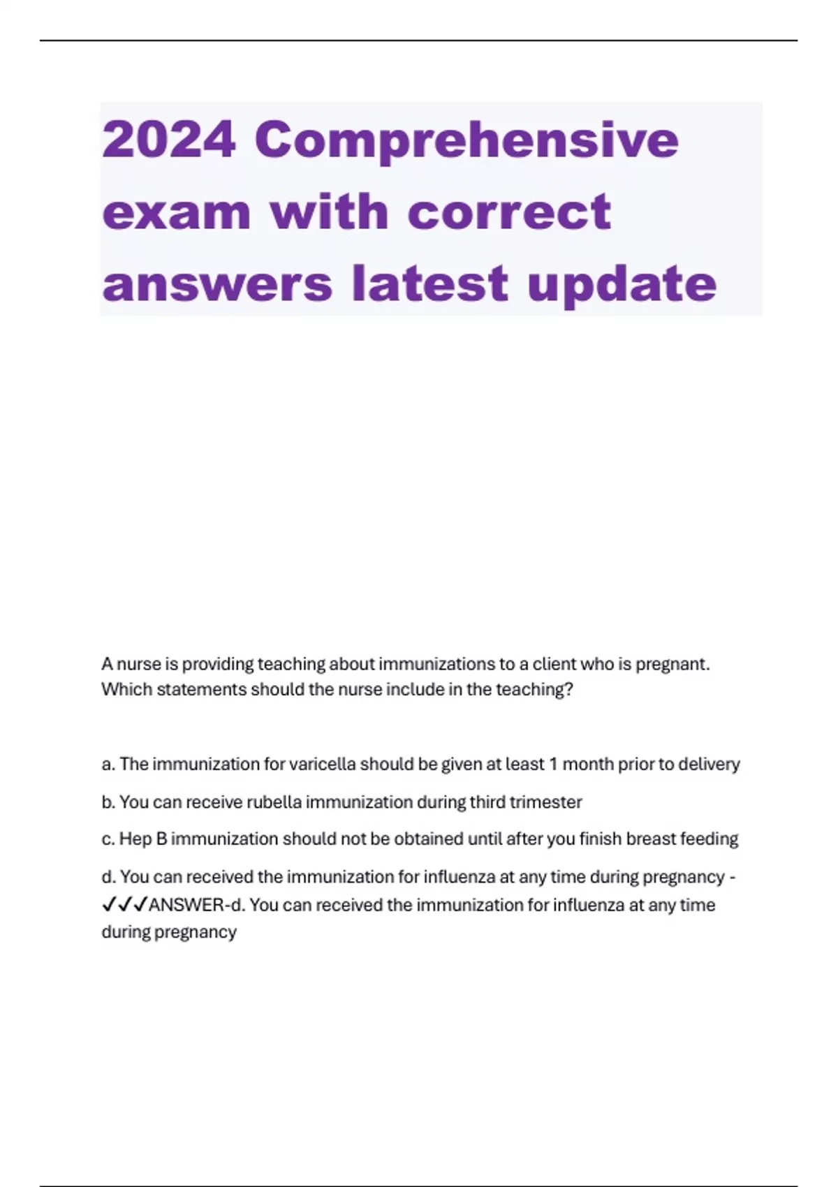 2024 Comprehensive exam with correct answers latest update A nurse is providing teaching about immunizations to a client who is pregnant. Which statements should the nurse include in the teaching? a. The immunization for varicella should be given at least 1 month prior to delivery b. You can receive rubella immunization during third trimester c. Hep B immunization should not be obtained until after you finish breast feeding d. You can received the immunization for influenza at any time during pregnancy - ANSWER-d. You can received the immunization for influenza at any time during pregnancy