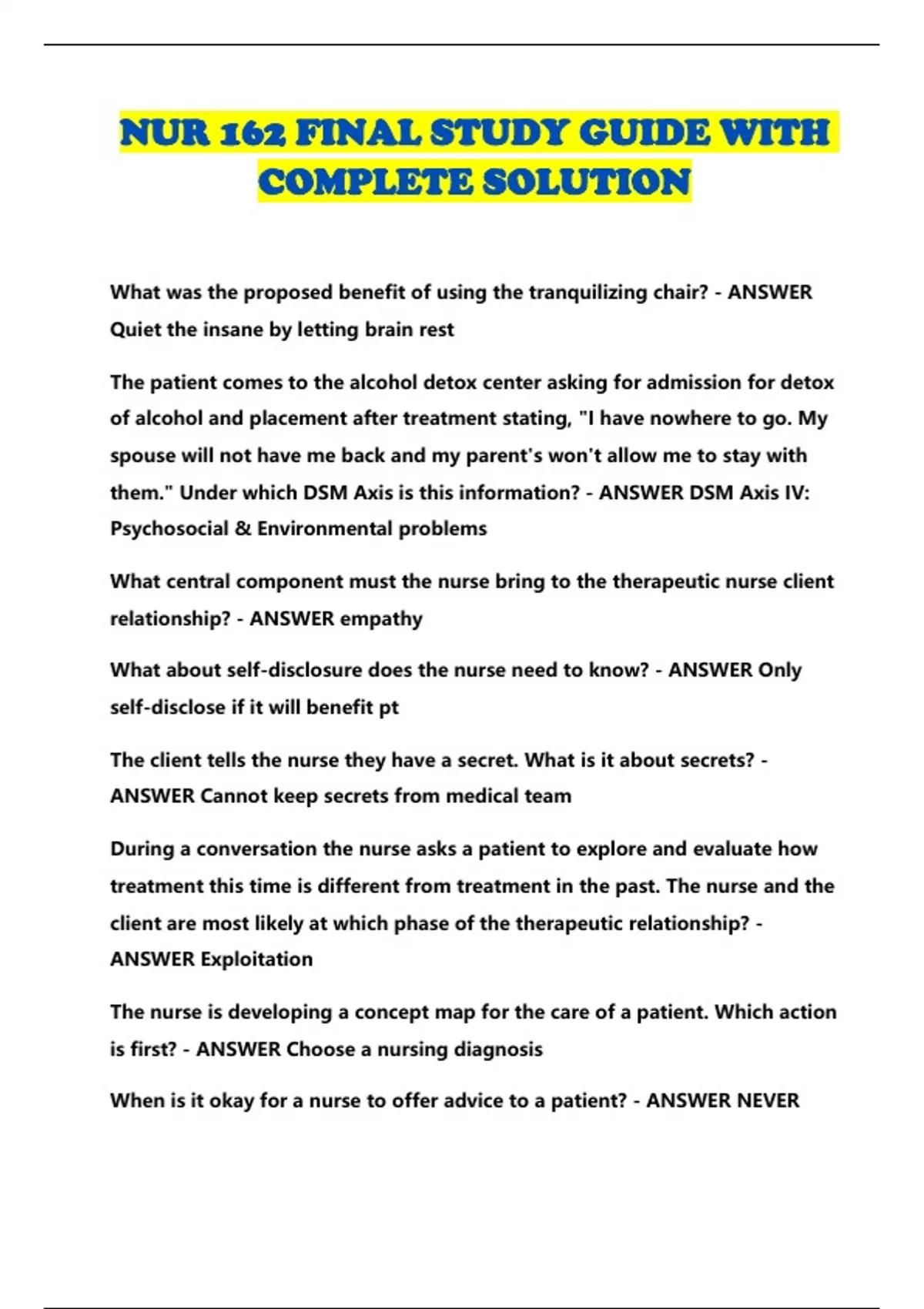 nur 162 final study guide with complete solution