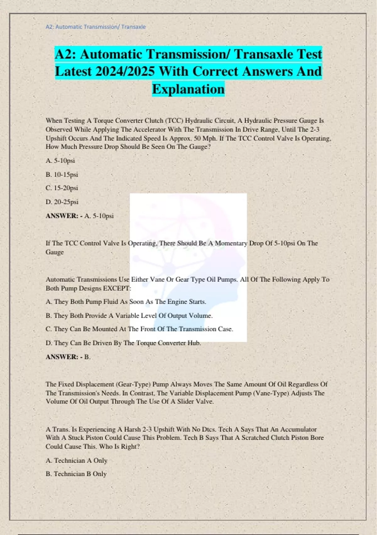 A2: Automatic Transmission/ Transaxle Test Latest 2024/2025 With Correct Answers And Explanation