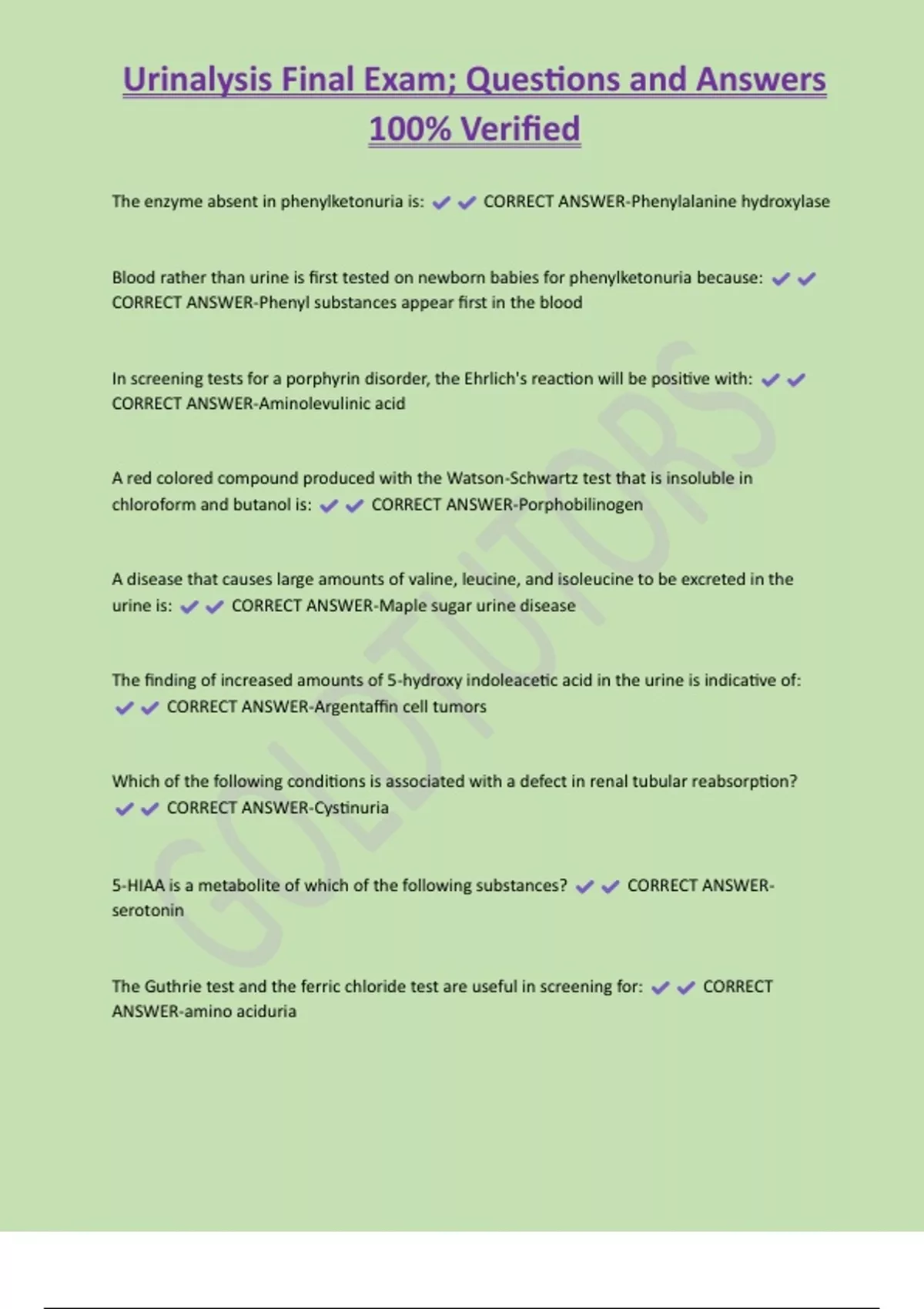Urinalysis Final Exam; Questions and Answers 100% Verified The enzyme absent in phenylketonuria is: CORRECT ANSWER-Phenylalanine hydroxylase Blood rather than urine is first tested on newborn babies for phenylketonuria because: CORRECT ANSWER-Phenyl substances appear first in the blood In screening tests for a porphyrin disorder, the Ehrlich's reaction will be positive with: CORRECT ANSWER-Aminolevulinic acid