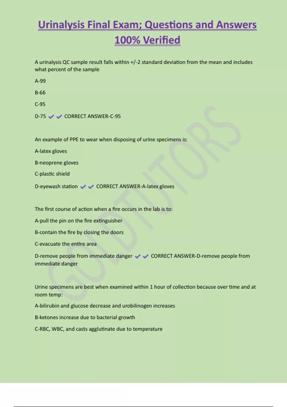 Urinalysis Final Exam; Questions and Answers 100% Verified A urinalysis QC sample result falls within +/-2 standard deviation from the mean and includes what percent of the sample A-99 B-66 C-95 D-75 CORRECT ANSWER-C-95 An example of PPE to wear when disposing of urine specimens is: A-latex gloves B-neoprene gloves C-plastic shield D-eyewash station CORRECT ANSWER-A-latex glove