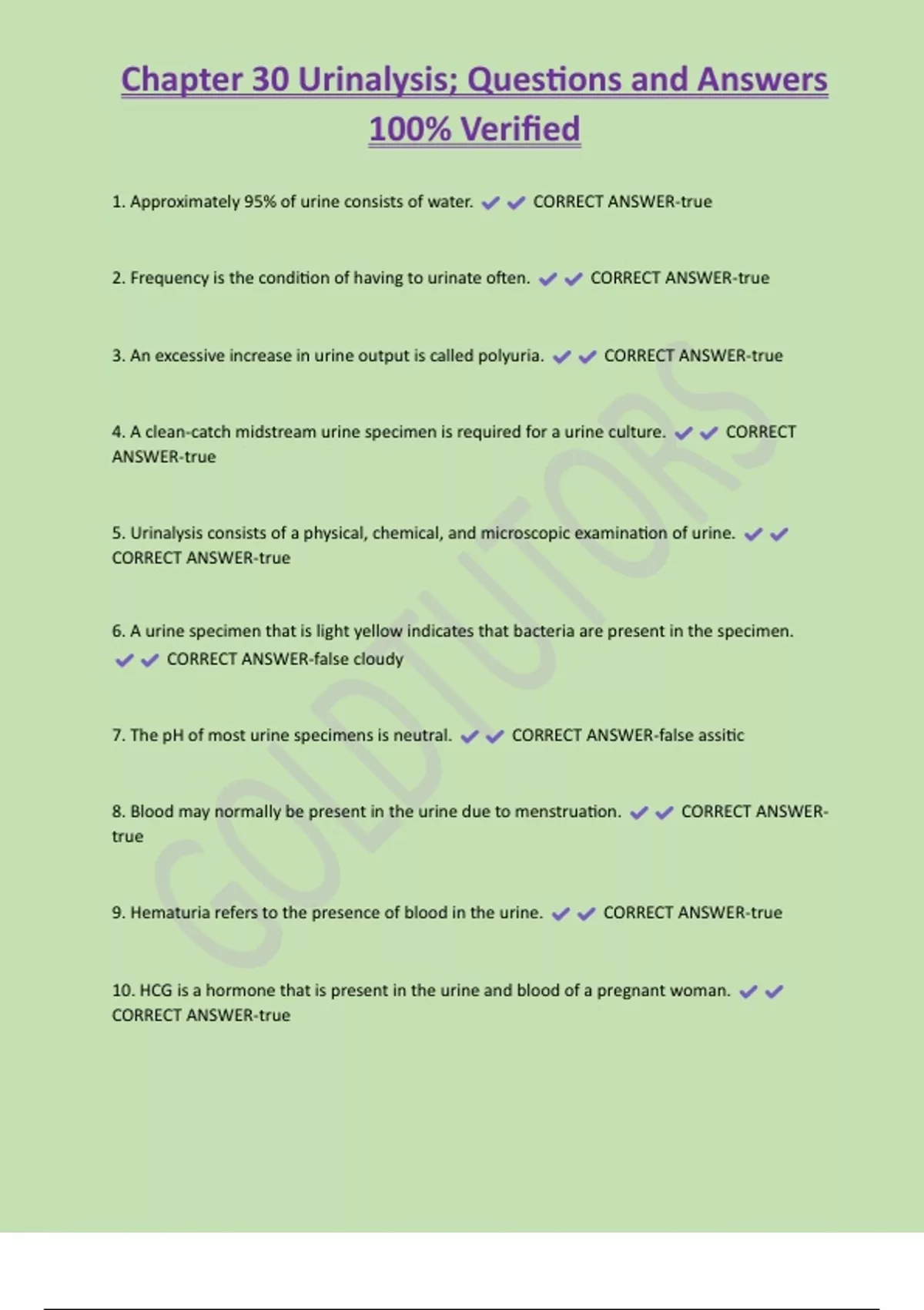 Chapter 30 Urinalysis; Questions and Answers 100% Verified 1. Approximately 95% of urine consists of water. CORRECT ANSWER-true 2. Frequency is the condition of having to urinate often. CORRECT ANSWER-true 3. An excessive increase in urine output is called polyuria. CORRECT ANSWER-true 4. A clean-catch midstream urine specimen is required for a urine culture. CORRECT ANSWER-true 5. Urinalysis consists of a physical, chemical, and microscopic examination of urine. CORRECT ANSWER-true