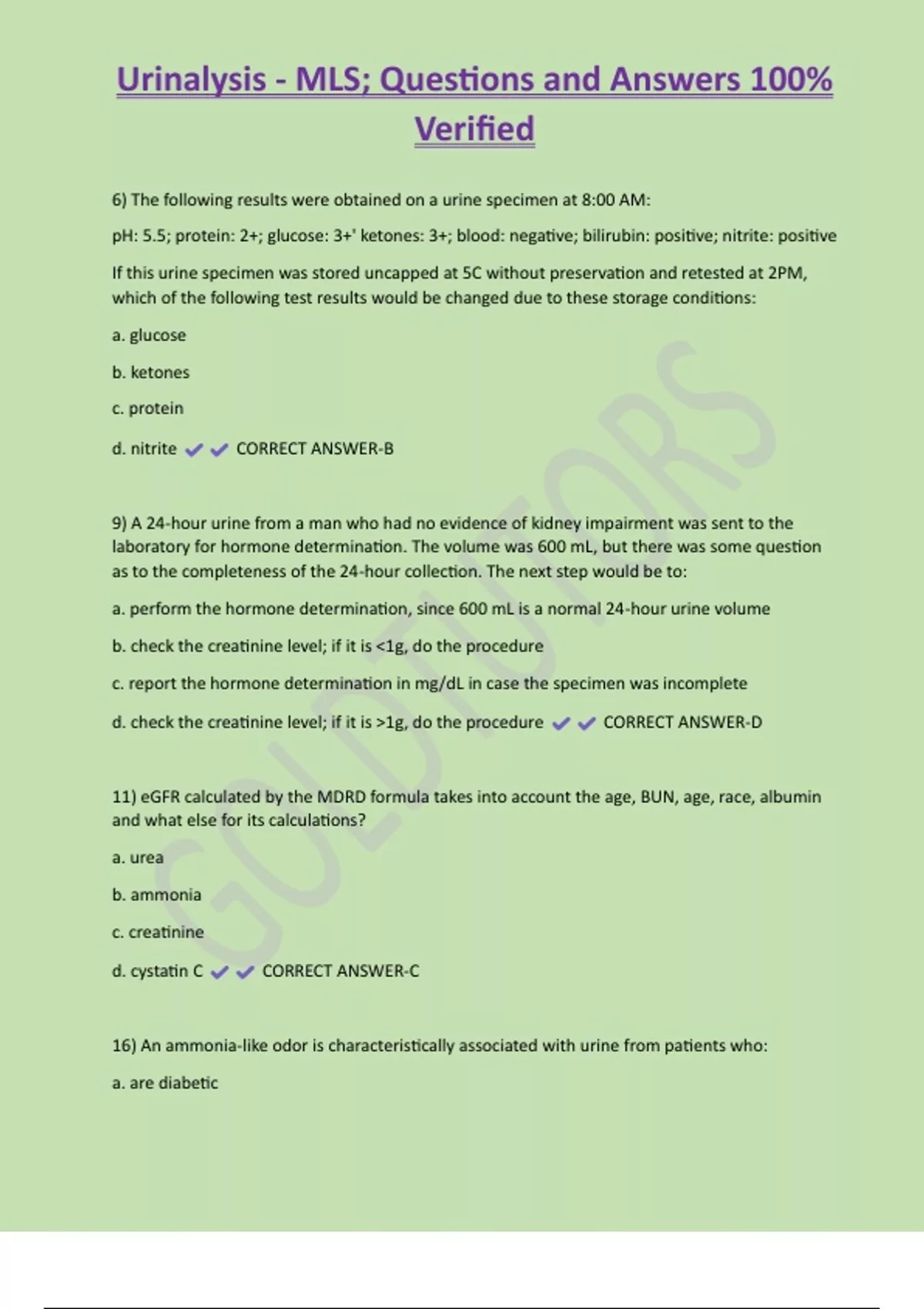 Urinalysis - MLS; Questions and Answers 100% Verified