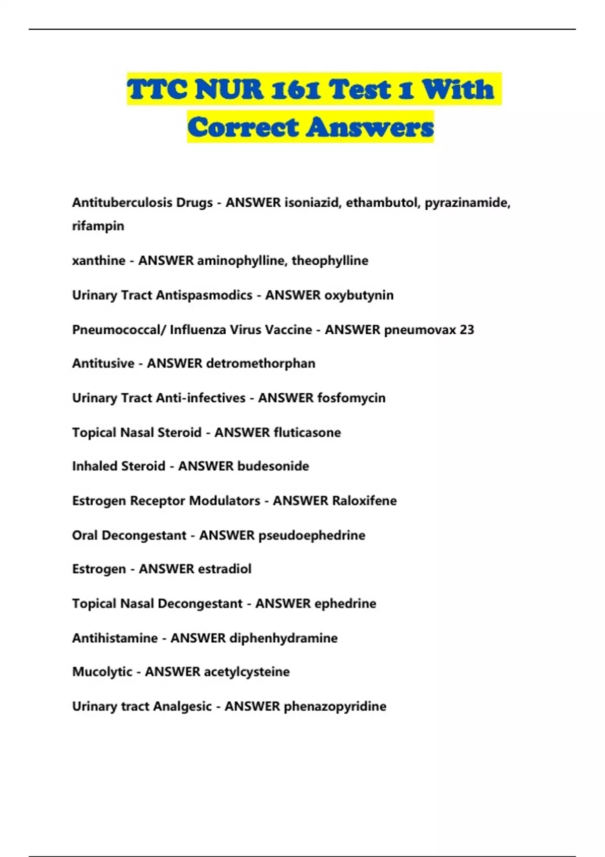 TTC NUR 161 Test 1 With Correct Answers