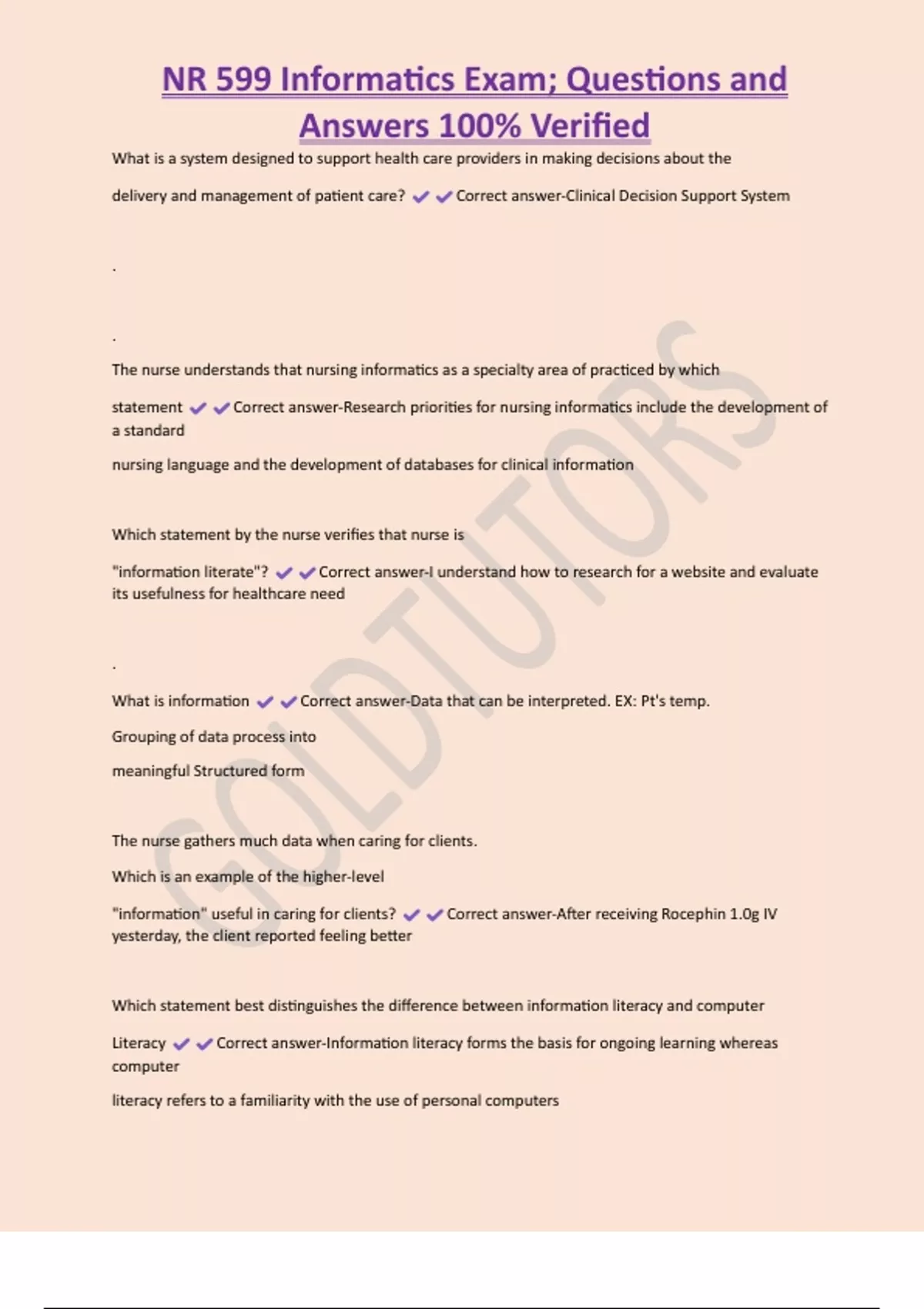 NR 599 Informatics Exam; Questions and Answers 100% Verified What is a system designed to support health care providers in making decisions about the delivery and management of patient care? Correct answer-Clinical Decision Support System . . The nurse understands that nursing informatics as a specialty area of practiced by which statement Correct answer-Research priorities for nursing informatics include the development of a standard nursing language and the development of databases for clinical information Which statement by the nurse verifies that nurse is "information literate"? Correct answer-I understand how to research for a website and evaluate its usefulness for healthcare need