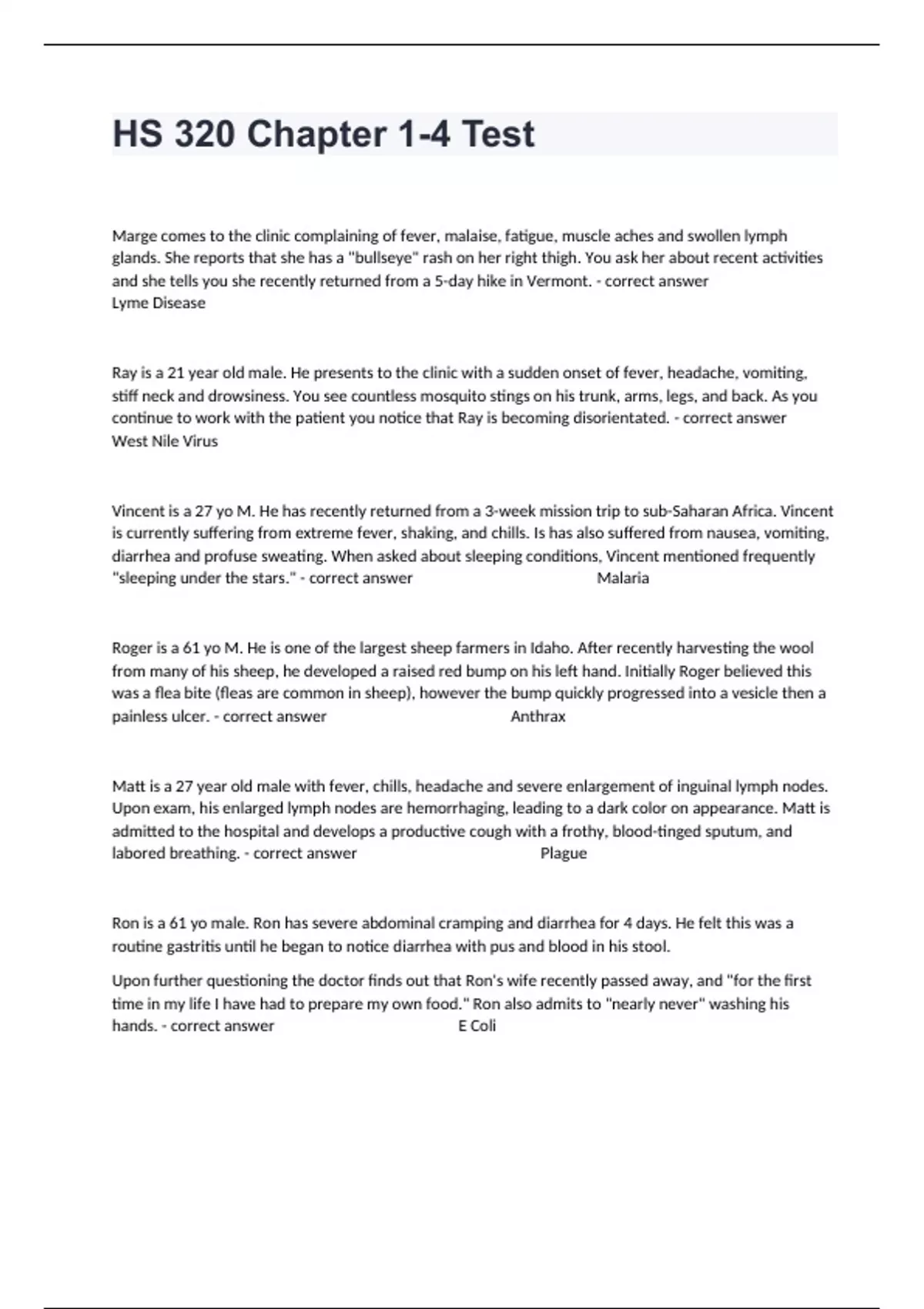 Marge comes to the clinic complaining of fever, malaise, fatigue, muscle aches and swollen lymph glands. She reports that she has a "bullseye" rash on her right thigh. You ask her about recent activities and she tells you she recently returned from a 5-day hike in Vermont. - correct answer Lyme Disease Ray is a 21 year old male. He presents to the clinic with a sudden onset of fever, headache, vomiting, stiff neck and drowsiness. You see countless mosquito stings on his trunk, arms, legs, and back. As you continue to work with the patient you notice that Ray is becoming disorientated. - correct answer West Nile Virus Vincent is a 27 yo M. He has recently returned from a 3-week mission trip to sub-Saharan Africa. Vincent is currently suffering from extreme fever, shaking, and chills. Is has also suffered from nausea, vomiting, diarrhea and profuse sweating. When asked about sleeping conditions, Vincent mentioned frequently "sleeping under the stars." - correct answer Malaria Roger is a 61 yo M. He is one of the largest sheep farmers in Idaho. After recently harvesting the wool from many of his sheep, he developed a raised red bump on his left hand. Initially Roger believed this was a flea bite (fleas are common in sheep), however the bump quickly progressed into a vesicle then a painless ulcer. - correct answer Anthrax Matt is a 27 year old male with fever, chills, headache and severe enlargement of inguinal lymph nodes. Upon exam, his enlarged lymph nodes are hemorrhaging, leading to a dark color on appearance. Matt is admitted to the hospital and develops a productive cough with a frothy, blood-tinged sputum, and labored breathing. - correct answer Plague Ron is a 61 yo male. Ron has severe abdominal cramping and diarrhea for 4 days. He felt this was a routine gastritis until he began to notice diarrhea with pus and blood in his stool. Upon further questioning the doctor finds out that Ron's wife recently passed away, and "for the first time in my life I have had to prepare my own food." Ron also admits to "nearly never" washing his hands. - correct answer E Coli Tiffany 4 yo Female presents to you clinic with her mother. The mother is frantic. She states Tiffany "can't breathe." While the physician attends to Tiffany, the nurse collects Tiffany's history from her mother. Tiffany has had some vomiting and diarrhea for two days Mom attributed to the flu. Yesterday she noticed Tiffany was falling over and had difficulty maintaining her balance. The very alert nurse asked Mom about ingestion of home-canned items. Tiffany mother reports she cans frequently and a large part of the family's diet is home canned food. After the initial work-up and brief discussion with his nurse, Tiffany was started on oxygen, a IV was started and the doctor calls the ambulance. - correct answer Botulism Sara is a 2 yo F. Her mother brings her to the clinic concerned about "constant" diarrhea. Mother has noticed blood in the stool. The patient has also had recurrent vomiting and appears dehydrated. Upon further questioning, mother reports 3 other children at Sara's day-care has had similar symptoms. - correct answer Infectious Diarrheal Disease Jeremy has come home from work early today. When his wife asks why he is home he reports he has nasal congestion, a sore throat (pharyngitis ), and malaise. Jeremy's wife takes his temperature and it is currently 100.1. - correct answer Common Cold Fran is a 54 yo F. She presents to her primary care physician with her husband. See looks very ill. She reports a rapid onset of fever, chills, muscle aches, and cough. Upon further questioning she also reports severe headaches and a sore throat. Her temperature is currently 103.5. When asked about immunizations, she reports she has not had a vaccine in years. - correct answer Influenza Brian is a 18 yo M. He is avid skateboarder. Recently Brian lacerated his left hand (digit number 5) while skateboarding. Brian is used to injuries and thought nothing of the lesion and continued to skate. Three days later Brian's cut finger has worsened. He is now experiencing a very painful, swollen finger. It is warm to the touch and the entire finger is inflamed. Upon closer examination there is a purulent discharge from the lesion. - correct answer MRSA Paul is a 24 yo M who presents to the clinic complaining of a 25 lb weight loss in the last two months. Upon further questioning Paul reports he has recently experienced recurrent episodes of 'being sick.' Paul recounts symptoms including fevers, swollen lymph nodes, and fatigue. When asked about his sexual history Paul reports he has unprotected sex with both males and females. He reports having at least one unprotected sexual encounter with a new partner each week. - correct answer HIV/AIDS Aden is a 7 yo male who presents to your clinic with his mother. Mother is very concerned. She reports Aden has had a rash on his face and trunk for 3 days. He is also experiencing fevers (treated with Tylenol and Motrin), a runny nose, cough, and anorexia. Upon your examination, you notice reds spots on the inside of his mouth. The red spots have a very characteristic blue/white center. No history of immunizations. - correct answer Rubeola (Measles) Your daughter, Kyle, is 5 years old. She has been fighting what you thought was a cold for 2 days. Her symptoms have included malaise, fever, and earache. You have treated her with Ibuprofen will some relief. However, this morning she woke up and you noticed swelling the right side of her face. She is very tender in this region and her earache has worsened. The patient is not currently up-to-date on her immunizations. - correct answer Mumps Matt is your 4 yo neighbor. He loves to play with your son, Brandon. One day Matt comes over to your house to play Legos with Brandon. However, you notice Matt has a rash on his face and arms. You look closely and notice lesions in multiple stages. Some are red spots, others are vesicles (fluid-filled), and others are s