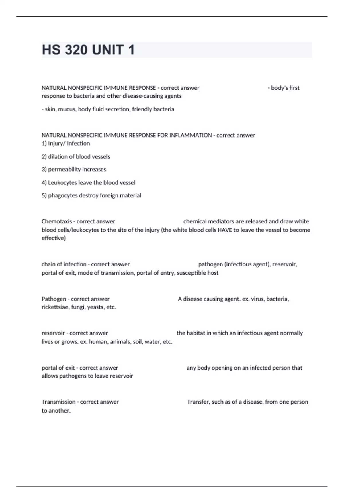 NATURAL NONSPECIFIC IMMUNE RESPONSE - correct answer - body's first response to bacteria and other disease-causing agents - skin, mucus, body fluid secretion, friendly bacteria NATURAL NONSPECIFIC IMMUNE RESPONSE FOR INFLAMMATION - correct answer 1) Injury/ Infection 2) dilation of blood vessels 3) permeability increases 4) Leukocytes leave the blood vessel 5) phagocytes destroy foreign material Chemotaxis - correct answer chemical mediators are released and draw white blood cells/leukocytes to the site of the injury (the white blood cells HAVE to leave the vessel to become effective) chain of infection - correct answer pathogen (infectious agent), reservoir, portal of exit, mode of transmission, portal of entry, susceptible host Pathogen - correct answer A disease causing agent. ex. virus, bacteria, rickettsiae, fungi, yeasts, etc. reservoir - correct answer the habitat in which an infectious agent normally lives or grows. ex. human, animals, soil, water, etc. portal of exit - correct answer any body opening on an infected person that allows pathogens to leave reservoir Transmission - correct answer Transfer, such as of a disease, from one person to another. direct transmission - correct answer Transmission of blood or body fluids through touching (including shaking hands), kissing, coughing, sneezing, and talking. indirect transmission - correct answer Transmission of blood or body fluids through contact with an intermediate contaminated object such as a razor, extractor, nipper, or an environmental surface, airborne portal of entry - correct answer a way for the causative agent to enter a new reservoir or host. breathing in, eating it, licking it, rubbing eyes, sex susceptible host - correct answer a person likely to get an infection or disease, usually because body defenses are weak fungi - correct answer Present in soil, air, or water. Thrive in warm, dark, moist environments Tinea Corporis (ringworm), Tinea Pedis (athlete's foot) Rickettsiae - correct answer Bacteria-like organisms transmitted through a vector like through the bites of fleas, lice, ticks mosquitoes, and mites Rocky Mountain Spotted Fever Parasites - correct answer - Protozoa Microscopic single-celled parasitic animals Release toxins/enzymes that destroy cells or interfere with function Malaria - Metazoa Multi-cellular parasitic animals (worms) Tapeworm, roundworms, flukes Lodge in various body parts - compete for the body's food Viruses - correct answer - Smallest disease causing agents seen with an electron microscope - Borrow cell's machinery to reproduce and burst out of cell or may stay in cell to synthesize new viruses without disturbing the cell - May coexist indefinitely in human peacefully - Outside factors may activate virus, leading to presence of actual disease. - Needs the cell to live Bacteria - correct answer Single-celled organism. Most are harmless, even beneficial. Classified by their shape. Chest Trauma - correct answer Penetrating wounds like knife, gunshot. Blunt-force trauma (car accident). Abdominopelvic Trauma - correct answer May cause hemorrhages of the internal organs including liver, spleen, pancreas, kidneys, stomach. Blood loss is a concern. Surgery is used to correct the injury. Neck and Spine Trauma - correct answer Fractures, dislocations, contusions, and compressions of the vertebral column. Could cause paralysis. Extremities Trauma - correct answer Sprains, strains, and fracture of arms or legs Other things besides pathogens & Injuries that cause diseases: - correct answer Extreme Heat and Cold Ionizing Radiation Extremes of Atmospheric Pressure Electric Shock Poisoning Near-drowning Bites of Insects, Spiders, and Snakes Asphyxiation Burns neoplasm - correct answer new growth benign - correct answer mild, not cancerous malignant - correct answer cancerous, can break off and spread throughout the body humoral immunity - correct answer specific immunity produced by B cells that produce antibodies that circulate in body fluids. binds to pathogens and mark them for destruction cell-mediated immunity - correct answer type of immunity produced by T cells that attack infected or abnormal body cells and attack foreign material acquire immunity - correct answer immunity developed by the body over a period of time active - correct answer body produces own antibodies passive - correct answer you are given antibodies natural - correct answer no medical intervention artificial - correct answer need the help of medical intervention active-natural - correct answer ex. naturally exposed to chickenpox and produce own antibodies active-artifical - correct answer vaccination passive natural - correct answer breastmilk and placenta passive artifical - correct answer given an injection or inoculation of antibodies allergy - correct answer overactive or misdirected immune system response, sensitivity to shock urticaria - correct answer allergic reaction of the skin characterized by the eruption of pale red or white, elevated patches called wheals or hives Anaphylaxis - correct answer a severe response to an allergen in which the symptoms develop quickly, and without help, the patient can die within a few minutes. pruritus - correct answer severe itching erythema - correct answer redness of the skin edema - correct answer soft tissue swelling stridor - correct answer strained, high-pitched sound heard on inspiration caused by obstruction in the pharynx or larynx Dyspnea - correct answer difficult or labored breathing acute pain - correct answer NOT about length of time. Acute is the normal expected amount of time for pain considering the specific injury. Sudden, onset pain chronic pain - correct answer pain that continues beyond the normal expected time for resolution nociceptive pain - correct answer tissue pain neuropathic pain - correct answer nerve pain angina - correct answer suffocating chest pain breakthrough pain - correct answer pain restarts or escalates after a previous injury has already been