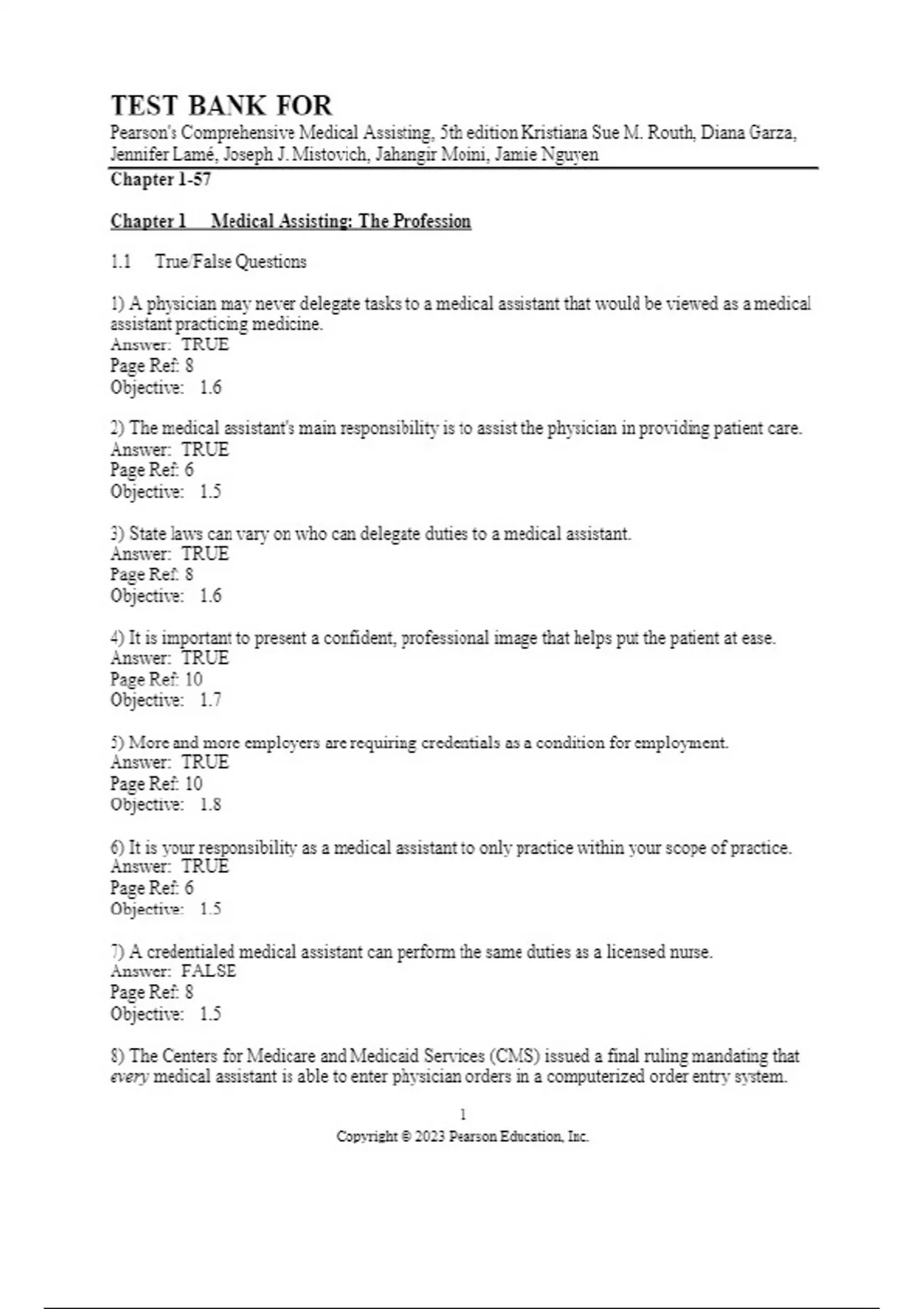 Test Bank For Pearson's Comprehensive Medical Assisting, 5th Edition by Kristiana Sue M. Routh, Diana Garza, Jennifer Lamé, Joseph J. Mistovich, Jahangir Moini, Jamie Nguyen Chapter 1-57