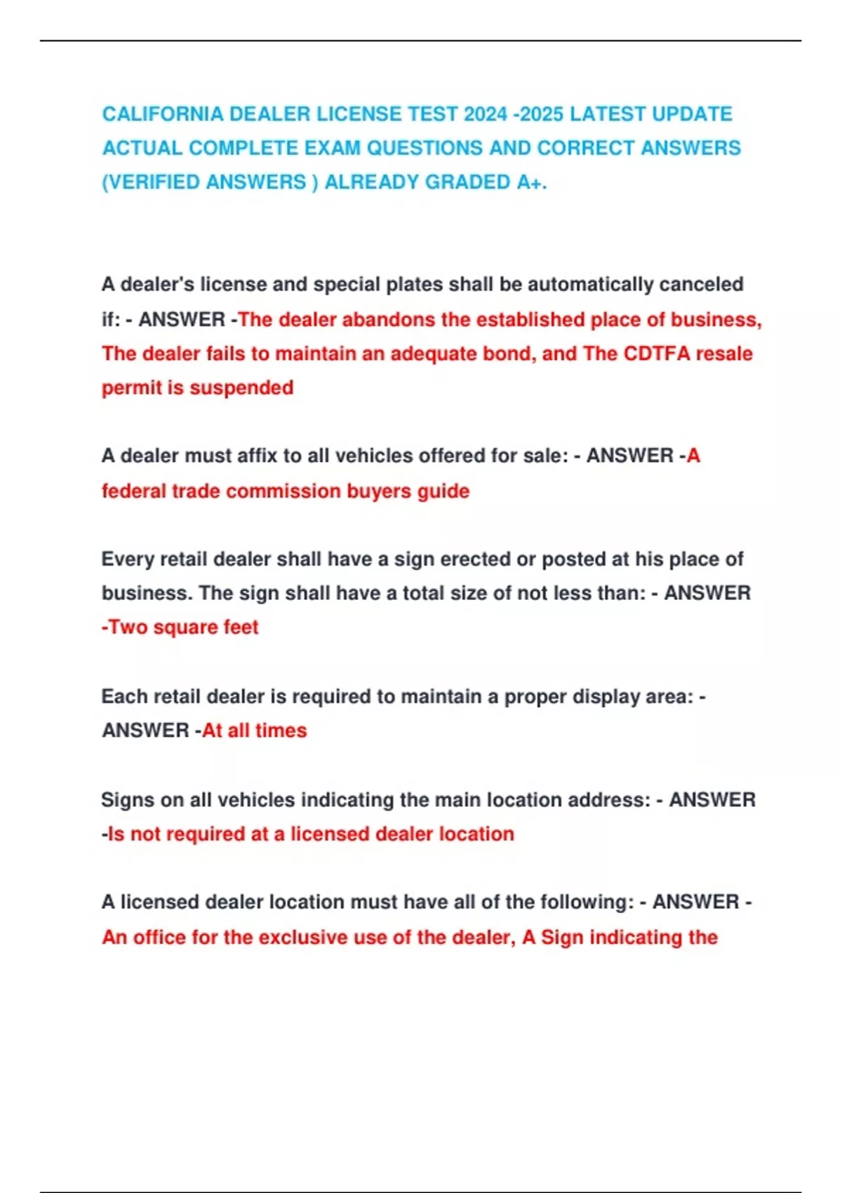 CALIFORNIA DEALER LICENSE TEST LATEST UPDATE ACTUAL COMPLETE EXAM QUESTIONS AND CORRECT ANSWERS (VERIFIED ANSWERS ) ALREADY GRADED A+. CALIFORNIA DEALER LICENSE TEST LATEST UPDATE ACTUAL COMPLETE EXAM QUESTIONS AND CORRECT ANSWERS (VERIFIED ANSWERS ) ALREADY GRADED A+. CALIFORNIA DEALER LICENSE TEST LATEST UPDATE ACTUAL COMPLETE EXAM QUESTIONS AND CORRECT ANSWERS (VERIFIED ANSWERS ) ALREADY GRADED A+. CALIFORNIA DEALER LICENSE TEST LATEST UPDATE ACTUAL COMPLETE EXAM QUESTIONS AND CORRECT ANSWERS (VERIFIED ANSWERS ) ALREADY GRADED A+. CALIFORNIA DEALER LICENSE TEST LATEST UPDATE ACTUAL COMPLETE EXAM QUESTIONS AND CORRECT ANSWERS (VERIFIED ANSWERS ) ALREADY GRADED A+. CALIFORNIA DEALER LICENSE TEST LATEST UPDATE ACTUAL COMPLETE EXAM QUESTIONS AND CORRECT ANSWERS (VERIFIED ANSWERS ) ALREADY GRADED A+. CALIFORNIA DEALER LICENSE TEST LATEST UPDATE ACTUAL COMPLETE EXAM QUESTIONS AND CORRECT ANSWERS (VERIFIED ANSWERS ) ALREADY GRADED A+. CALIFORNIA DEALER LICENSE TEST LATEST UPDATE ACTUAL COMPLETE EXAM QUESTIONS AND CORRECT ANSWERS (VERIFIED ANSWERS ) ALREADY GRADED A+.