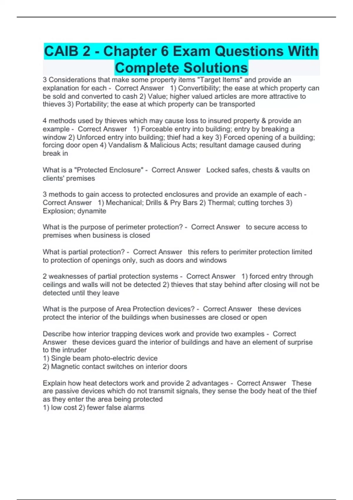 CAIB 2 - Chapter 6 Exam Questions With Complete Solutions 3 Considerations that make some property items "Target Items" and provide an explanation for each - Correct Answer 1) Convertibility; the ease at which property can be sold and converted to cash 2) Value; higher valued articles are more attractive to thieves 3) Portability; the ease at which property can be transported 4 methods used by thieves which may cause loss to insured property & provide an example - Correct Answer 1) Forceable entry into building; entry by breaking a window 2) Unforced entry into building; thief had a key 3) Forced opening of a building; forcing door open 4) Vandalism & Malicious Acts; resultant damage caused during break in What is a "Protected Enclosure" - Correct Answer Locked safes, chests & vaults on clients' premises 3 methods to gain access to protected enclosures and provide an example of each - Correct Answer 1) Mechanical; Drills & Pry Bars 2) Thermal; cutting torches 3) Explosion; dynamite What is the purpose of perimeter protection? - Correct Answer to secure access to premises when business is closed What is partial protection? - Correct Answer this refers to perimiter protection limited to protection of openings only, such as doors and windows 2 weaknesses of partial protection systems - Correct Answer 1) forced entry through ceilings and walls will not be detected 2) thieves that stay behind after closing will not be detected until they leave What is the purpose of Area Protection devices? - Correct Answer these devices protect the interior of the buildings when businesses are closed or open Describe how interior trapping devices work and provide two examples - Correct Answer these devices guard the interior of buildings and have an element of surprise to the intruder 1) Single beam photo-electric device 2) Magnetic contact switches on interior doors Explain how heat detectors work and provide 2 advantages - Correct Answer These are passive devices which do not