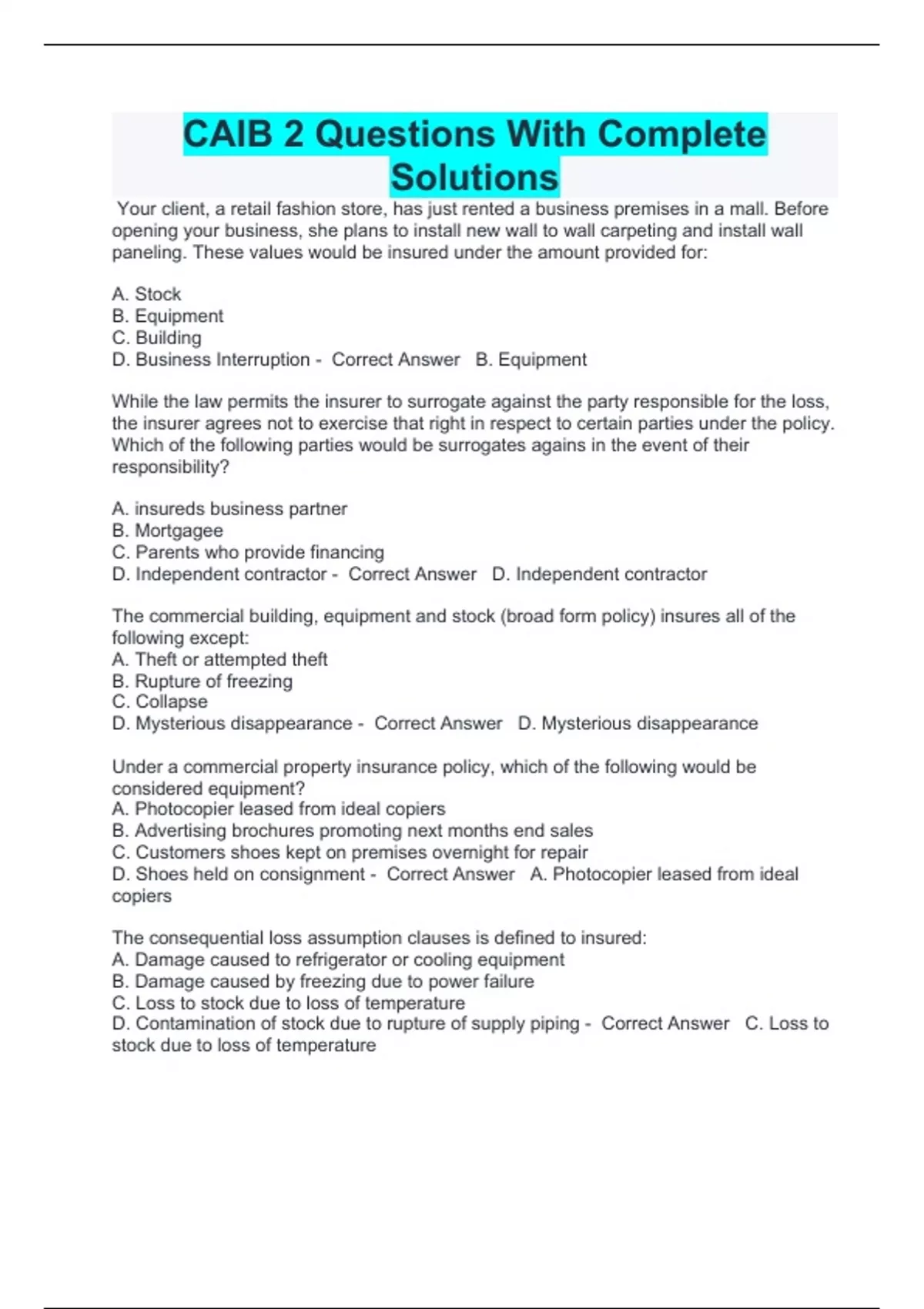 CAIB 2 Questions With Complete Solutions Your client, a retail fashion store, has just rented a business premises in a mall. Before opening your business, she plans to install new wall to wall carpeting and install wall paneling. These values would be insured under the amount provided for: A. Stock B. Equipment C. Building D. Business Interruption - Correct Answer B. Equipment While the law permits the insurer to surrogate against the party responsible for the loss, the insurer agrees not to exercise that right in respect to certain parties under the policy. Which of the following parties would be surrogates agains in the event of their responsibility? A. insureds business partner B. Mortgagee C. Parents who provide financing D. Independent contractor - Correct Answer D. Independent contractor The commercial building, equipment and stock (broad form policy) insures all of the following except: A. Theft or attempted theft B. Rupture of freezing C. Collapse D. Mysterious disappearance - Correct Answer D. Mysterious disappearance Under a commercial property insurance policy, which of the following would be considered equipment? A. Photocopier leased from ideal copiers B. Advertising brochures promoting next months end sales C. Customers shoes kept on premises overnight for repair D. Shoes held on consignment - Correct Answer A. Photocopier leased from ideal copiers The consequential loss assumption clauses is defined to insured: A. Damage caused to refrigerator or cooling equipment B. Damage caused by freezing due to power failure C. Loss to stock due to loss of temperature D. Contamination of stock due to rupture of supply piping - Correct Answer C. Loss to stock due to loss of temperature
