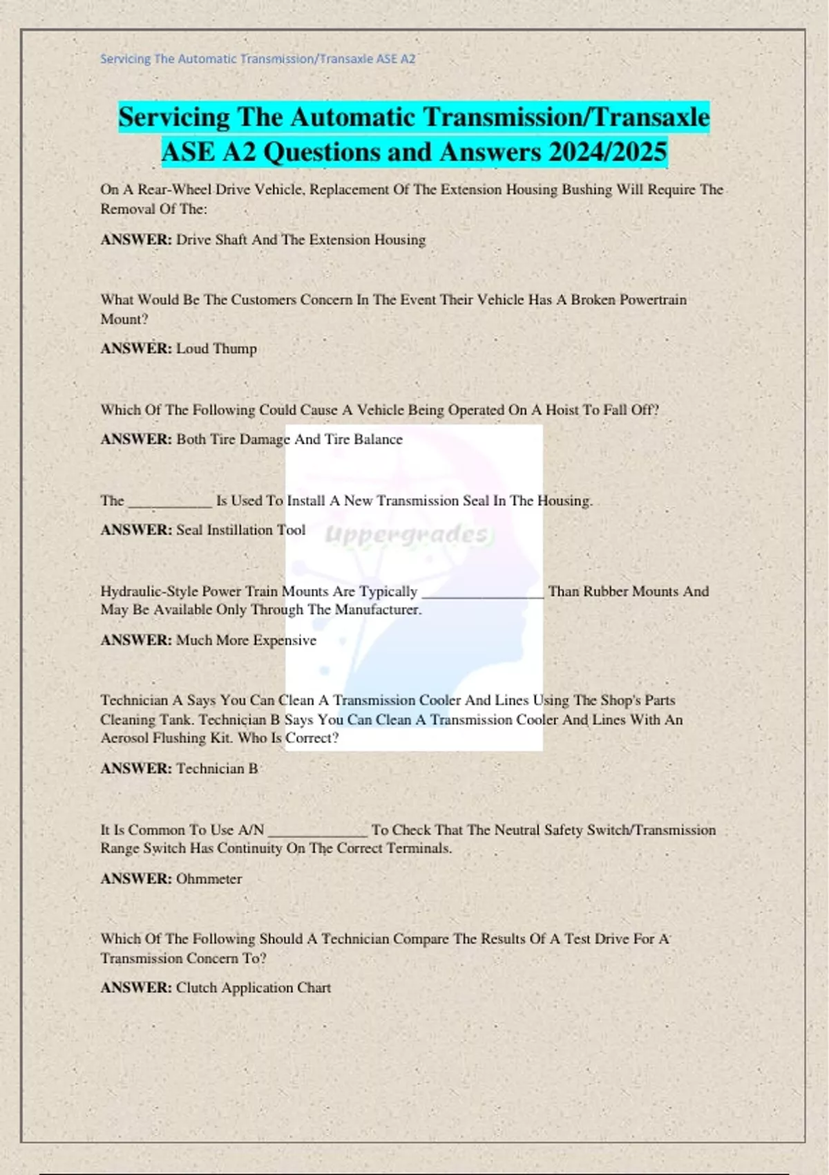 Servicing The Automatic Transmission/Transaxle ASE A2 Questions and Answers 2024/2025