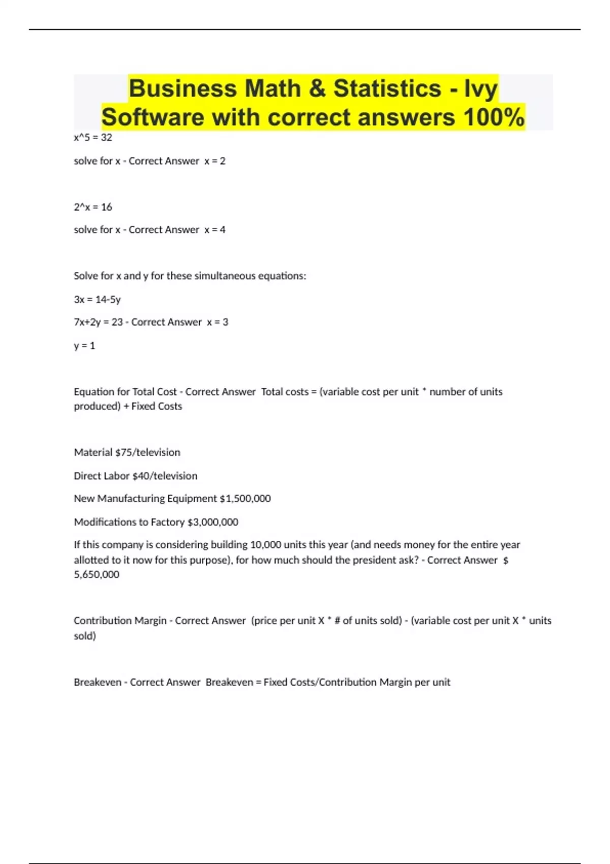 Business Math & Statistics - Ivy Software with correct answers 100% x^5 = 32 solve for x - Correct Answer x = 2 2^x = 16 solve for x - Correct Answer x = 4 Solve for x and y for these simultaneous equations: 3x = 14-5y 7x+2y = 23 - Correct Answer x = 3 y = 1 Equation for Total Cost - Correct Answer Total costs = (variable cost per unit * number of units produced) + Fixed Costs Material $75/television Direct Labor $40/television New Manufacturing Equipment $1,500,000 Modifications to Factory $3,000,000 If this company is considering building 10,000 units this year (and needs money for the entire year allotted to it now for this purpose), for how much should the president ask? - Correct Answer $ 5,650,000 Contribution Margin - Correct Answer (price per unit X * # of units sold) - (variable cost per unit X * units sold) Breakeven - Correct Answer Breakeven = Fixed Costs/Contribution Margin per unit A company is making a product and has invested $100,000 on an advertising campaign and $75,000 each on five salespeople (annual salary, including benefits and support). These are the only fixed costs that the company has assigned to the product, and the contribution margin per unit is $50. To cover those fixed costs, how many units will the company have to sell to breakeven? - Correct Answer [($75,000*5) + $100,000] / $50/unit = 9,500 (breakeven level in units) abscissa - Correct Answer The x-coordinate of a point (independent variable) ordinate - Correct Answer The y-coordinate of a point (dependent variable) True/False: the fixed costs for a certain project are $50 and it costs $2 to produce one unit. The equation that relates y (total costs) to x (total number of units produced) is y = 2 + 50x - Correct Answer False. It would be y = 50 + 2x Which of the following is the monomial expression? A) 4x^3 + 6x^4 +12x^3 + 45x^4 +6 B) 143x^4 + 3x^4 C) 143x^4 + 78x^4 + 6x^4 + 76 - Correct Answer B) 143x^4 + 3x^4 - its the only term where the x's can be added together to get one term Write an equation to related total cost to number of driveways paved. Asphalt, tar & concrete/driveway = $7,000 Direct Labor/Driveway = $12,000 Office Expenses & Other Labor = $5,000 - Correct Answer y = 19x + 5 Which of the following is the binomial expression? A) 4x^3 + 6x^4 +12x^3 + 45x^4 +6 B) 143x^4 + 3x^4 C) 143x^4 + 78x^4 + 6x^4 + 76 - Correct Answer C) 143x^4 + 78x^4 + 6x^4 + 76 - tis the only term where the x's can be added together to get two terms Which of the following is the trinomial expression? A) 4x^3 + 6x^4 +12x^3 + 45x^4 +6 B) 143x^4 + 3x^4 C) 143x^4 + 78x^4 + 6x^4 + 76 - Correct Answer A) 4x^3 + 6x^4 +12x^3 + 45x^4 +6 - its the only term where the x's can be added together to get three terms