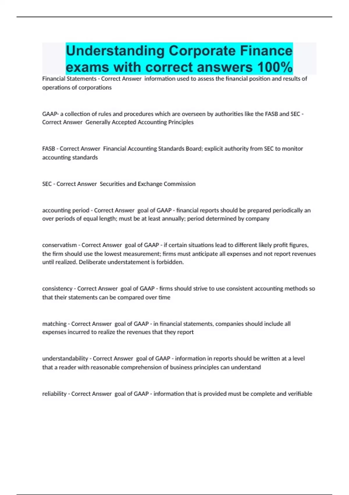 Understanding Corporate Finance exams with correct answers 100% Financial Statements - Correct Answer information used to assess the financial position and results of operations of corporations GAAP- a collection of rules and procedures which are overseen by authorities like the FASB and SEC - Correct Answer Generally Accepted Accounting Principles FASB - Correct Answer Financial Accounting Standards Board; explicit authority from SEC to monitor accounting standards SEC - Correct Answer Securities and Exchange Commission accounting period - Correct Answer goal of GAAP - financial reports should be prepared periodically an over periods of equal length; must be at least annually; period determined by company conservatism - Correct Answer goal of GAAP - if certain situations lead to different likely profit figures, the firm should use the lowest measurement; firms must anticipate all expenses and not report revenues until realized. Deliberate understatement is forbidden. consistency - Correct Answer goal of GAAP - firms should strive to use consistent accounting methods so that their statements can be compared over time matching - Correct Answer goal of GAAP - in financial statements, companies should include all expenses incurred to realize the revenues that they report understandability - Correct Answer goal of GAAP - information in reports should be written at a level that a reader with reasonable comprehension of business principles can understand reliability - Correct Answer goal of GAAP - information that is provided must be complete and verifiable Required Statements - Correct Answer balance sheet, income sheet, statement of owner's equity, statement of cash flows