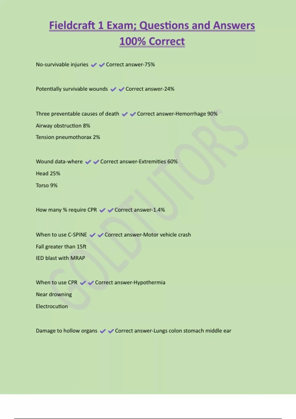 Fieldcraft 1 Exam; Questions and Answers 100% Correct No-survivable injuries Correct answer-75% Potentially survivable wounds Correct answer-24% Three preventable causes of death Correct answer-Hemorrhage 90% Airway obstruction 8% Tension pneumothorax 2% Wound data-where Correct answer-Extremities 60% Head 25% Torso 9%
