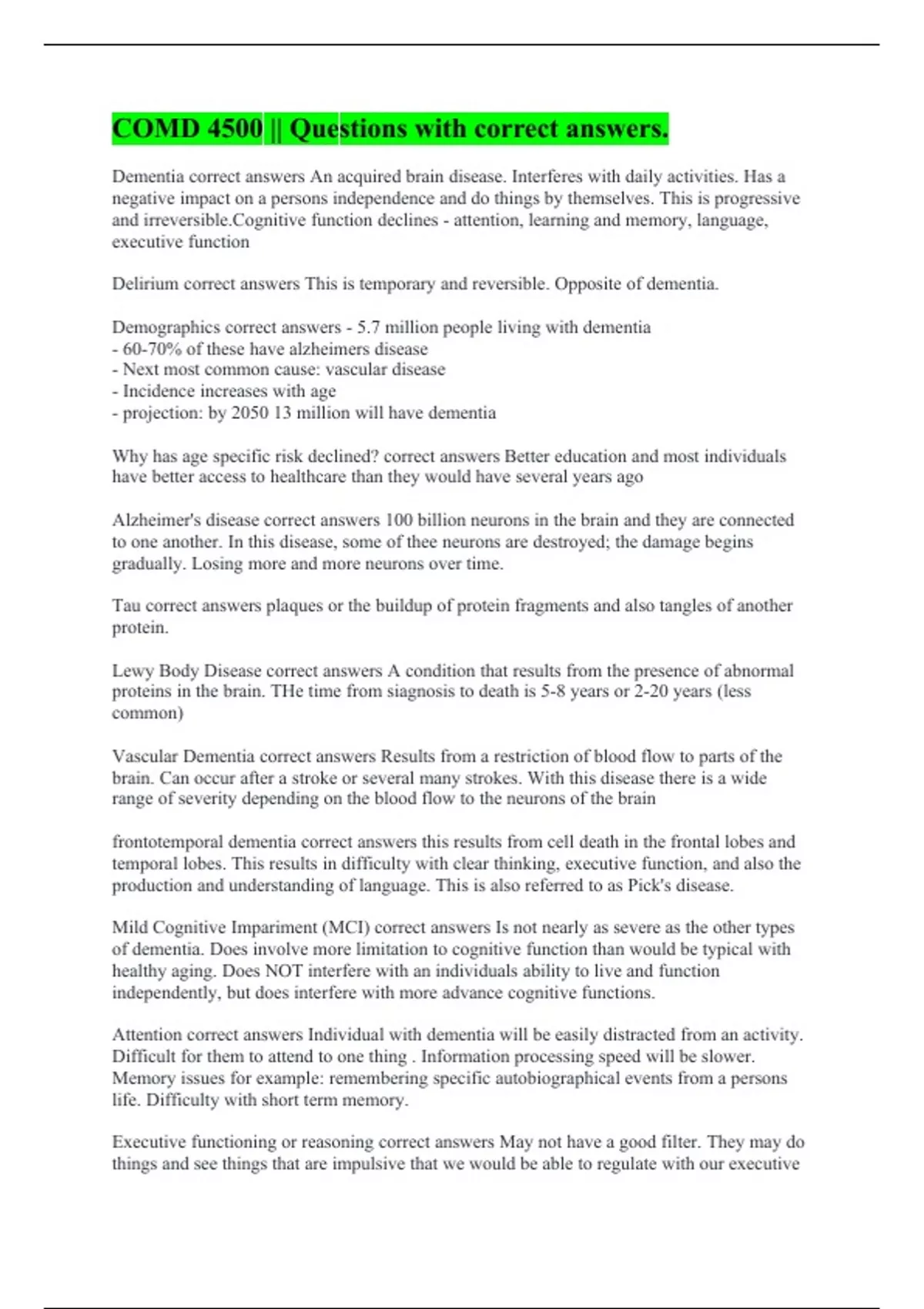 Dementia correct answers An acquired brain disease. Interferes with daily activities. Has a negative impact on a persons independence and do things by themselves. This is progressive and irreversible.Cognitive function declines - attention, learning and memory, language, executive function