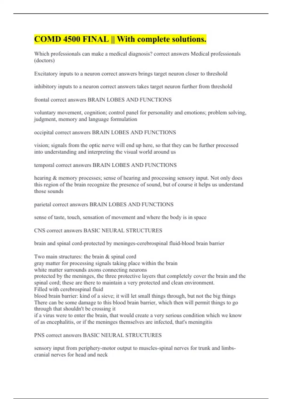 Which professionals can make a medical diagnosis? correct answers Medical professionals (doctors) Excitatory inputs to a neuron correct answers brings target neuron closer to threshold inhibitory inputs to a neuron correct answers takes target neuron further from threshold frontal correct answers BRAIN LOBES AND FUNCTIONS voluntary movement, cognition; control panel for personality and emotions; problem solving, judgment, memory and language formulation occipital correct answers BRAIN LOBES AND FUNCTIONS vision; signals from the optic nerve will end up here, so that they can be further processed into understanding and interpreting the visual world around us temporal correct answers BRAIN LOBES AND FUNCTIONS hearing & memory processes; sense of hearing and processing sensory input. Not only does this region of the brain recognize the presence of sound, but of course it helps us understand those sounds parietal correct answers BRAIN LOBES AND FUNCTIONS sense of taste, touch, sensation of movement and where the body is in space CNS correct answers BASIC NEURAL STRUCTURES brain and spinal cord-protected by meninges-cerebrospinal fluid-blood brain barrier Two main structures: the brain & spinal cord gray matter for processing signals taking place within the brain white matter surrounds axons connecting neurons protected by the meninges, the three protective layers that completely cover the brain and the spinal cord; these are there to maintain a very protected and clean environment. Filled with cerebrospinal fluid blood brain barrier: kind of a sieve; it will let small things through, but not the big things There can be some damage to this blood brain barrier, which then will permit things to go through that shouldn't be crossing it if a virus were to enter the brain, that would create a very serious condition which we know of as encephalitis, or if the meninges themselves are infected, that's meningitis PNS correct answers BASIC NEURAL STRUCTURES sensory input from periphery-motor output to muscles-spinal nerves for trunk and limbs-cranial nerves for head and neck
