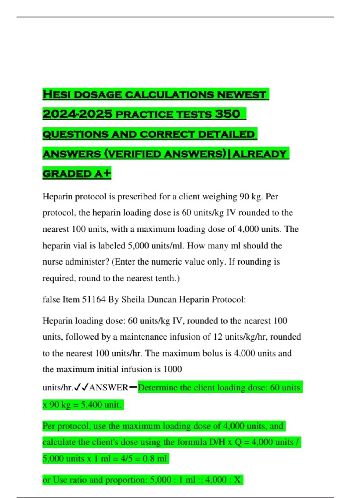Hesi dosage calculations newest practice tests 350 questions and correct detailed answers (verified answers)|already graded a+