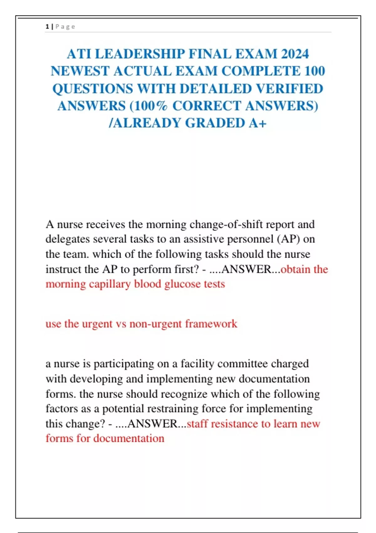 ATI LEADERSHIP FINAL EXAM 2024 NEWEST ACTUAL EXAM COMPLETE 100 QUESTIONS WITH DETAILED VERIFIED ANSWERS (100% CORRECT ANSWERS) /ALREADY GRADED A+